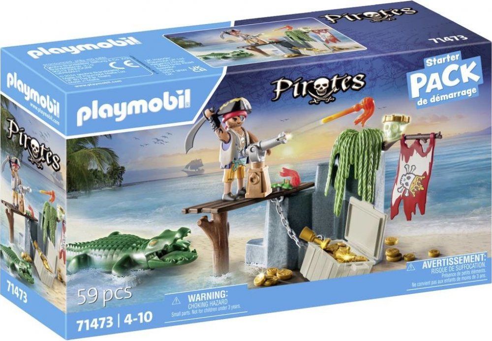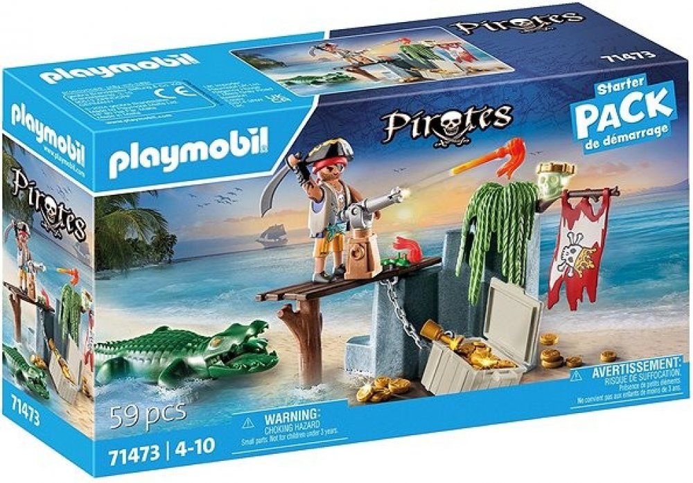 PLAYMOBIL startovací balíček pirát s aligátorem. Pirát se během své honby za pokladem setká s aligátorem, který číhá příliš blízko kýžené truhly s pokladem. Obsahuje lebku svítící ve tmě.