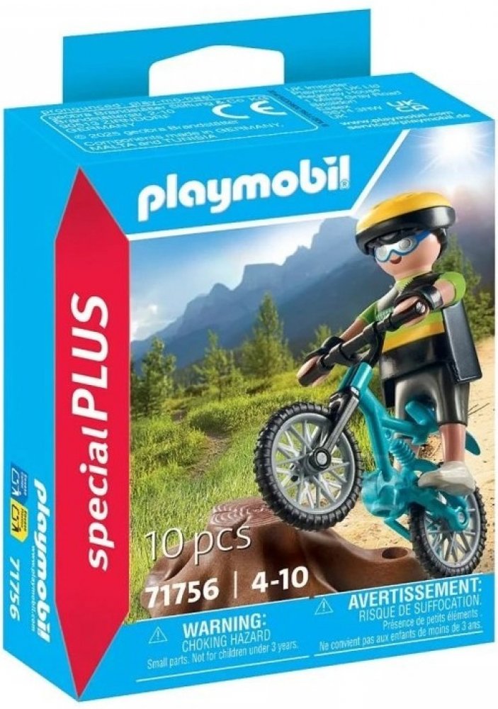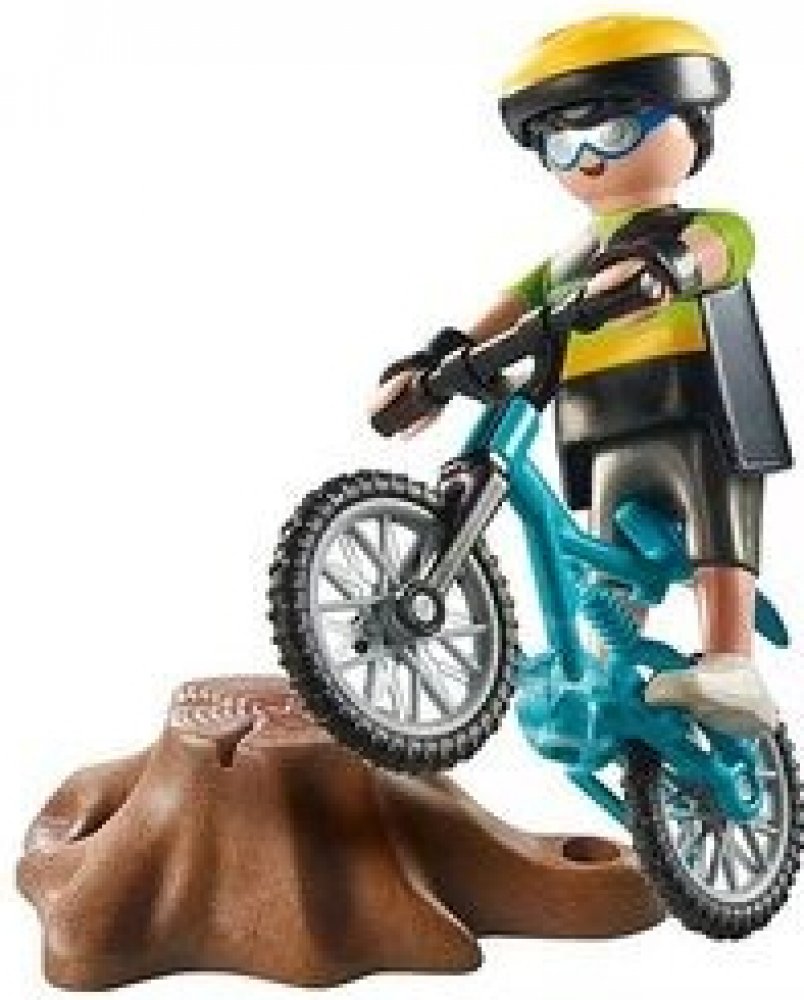 Cyklista PLAYMOBIL Special Plus s cool horským kolem a překážkou. Vyrazte na sjezdovku s cyklistou na horském kole PLAYMOBIL! Tato sada je ideální pro akční dobrodružství: stylový cyklista je vybaven sportovním horským kolem a praktickým stojanem pro rychlé zastavení. Robustní jezdec má odnímatelné chrániče paží a pevnou helmu – ideální do náročného terénu. Zahrnutá překážka vás zve k vzrušujícím skokům a kaskadérským kouskům. Ať už sjíždíte serpentinami nebo zdoláváte strmá stoupání, tento horský cyklista je vždy připraven na další výzvu. Ideální pro dobrodružné děti a outdoorové fanoušky: S touto sadou PLAYMOBIL Special Plus se vaší fantazii meze nekladou – pro zábavu na stezkách i mimo ně!