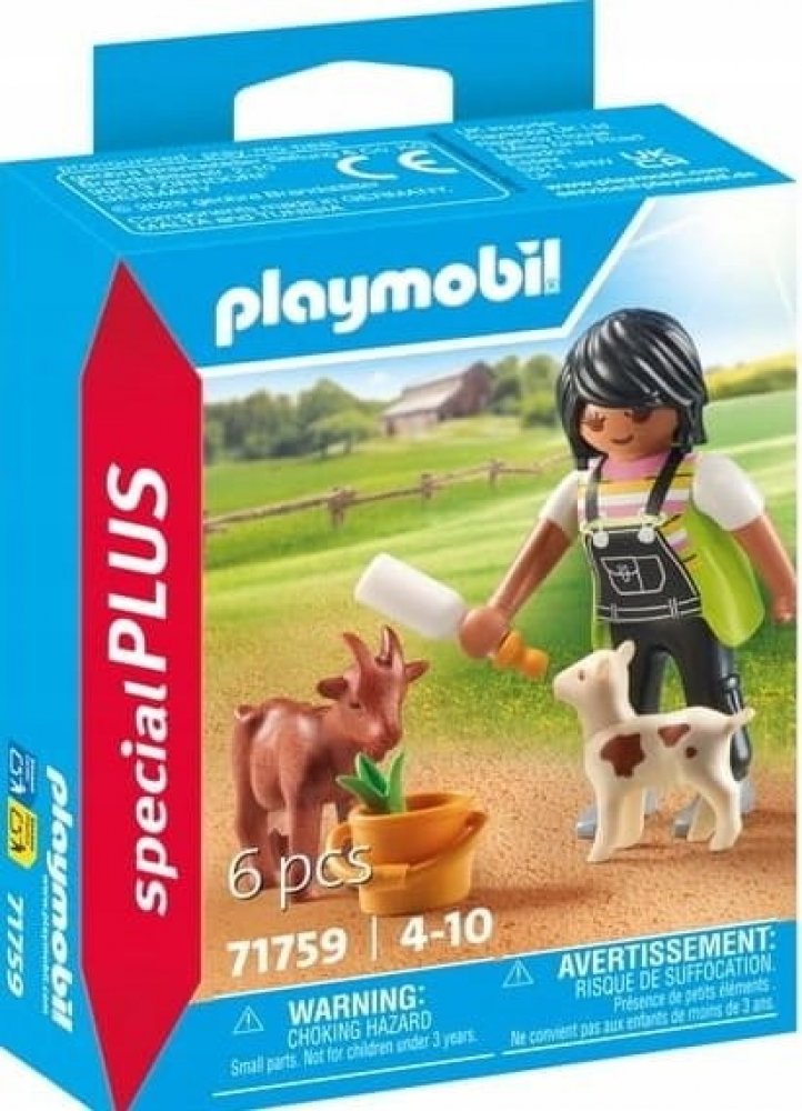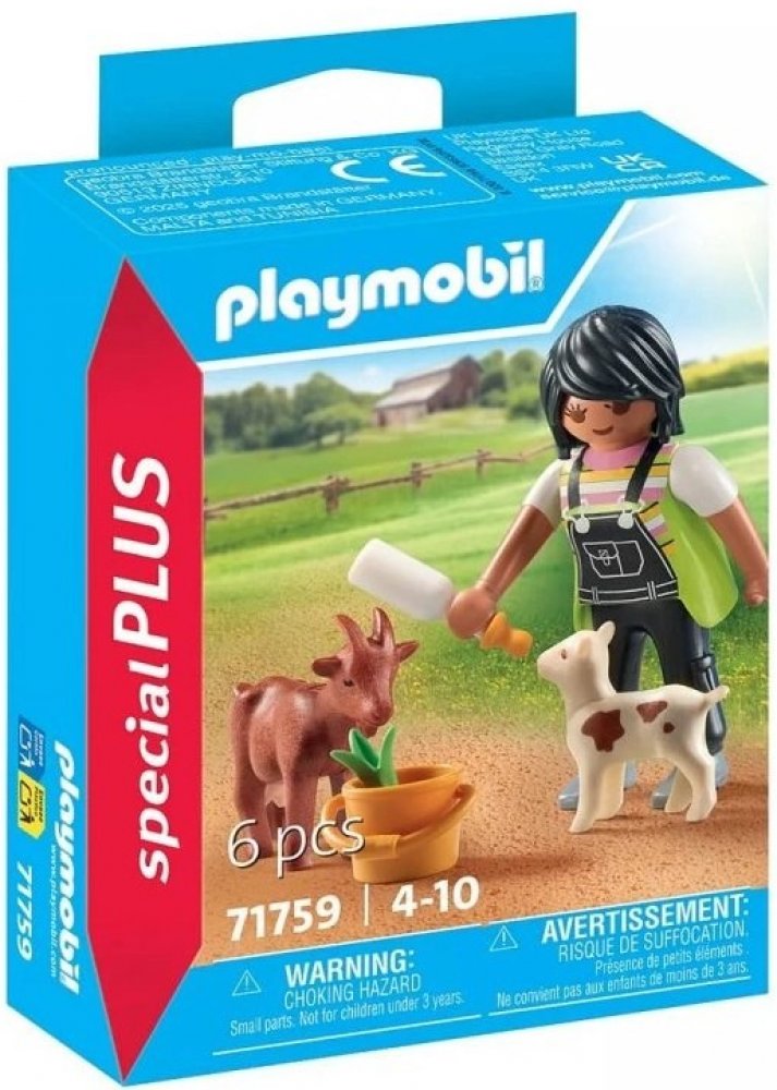 PLAYMOBIL Special Plus Chovatelka koz. Farmářka krmí kůzle lahví s mlékem, zatímco matka koza žere jídlo v kbelíku. Zažijte idylický venkovský život se sadou PLAYMOBIL Chovatelka koz! Ponořte se do poklidného světa farmy: Milující žena krmí hravé kůzlátko lahví na mléko, která jí perfektně padne do ruky. Nedaleko si kozí matka vychutnává jídlo z robustního kbelíku a její hlava při žvákání kývá nah...