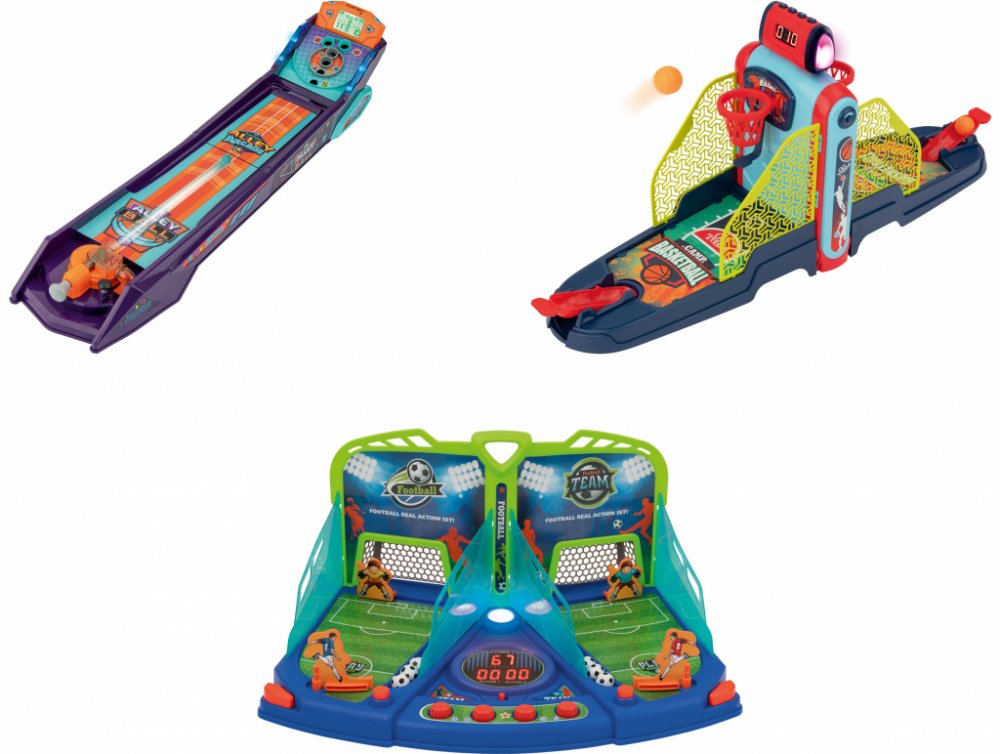 Playtive Elektronická stolní hra Podporuje koordinaci rukou a očí; zručnost a logické myšlení Poskytuje zábavu na mnoha místech: ideální pro malé místnosti i na cesty Digitální zobrazení a zvukové efekty Režim hry pro jednoho hráče a duelu Doporučený věk: od 3 let Alejový míč Rychlá hra s kuličkou na házení a střelbu Rychlá střelba a automatické vracení míčku Obsah: 1 x základní jednotka s elektronickým LED displejem a zvukovými efekty, 8 x žlutá a 8 x modrá plastová kulička Baterie: 3 x baterie AAA a 2 x baterie Lr44, 1,5 V Basketbal Nabízí 3 různé stupně obtížnosti Obsah: 1 x základní jednotka s elektronickým LED displejem a zvukovými efekty, 6 x basketbalový míč; 2 x zadní deska Baterie: 4 x AA Fotbal Rychlá střelba a automatické vracení míčku Nabízí 2 různé stupně obtížnosti Obsah: 1 x základní jednotka s elektronickým LED displejem a zvukovými efekty, 6 x fotbalový míč; 2 x brankář; 2 x hráč Baterie: 3 x AA Technické údaje Provoz na baterie Materiál PE, ABS Rozměry Alejový míč: cca 14,5 x 25 x 89 cm Š x V x H Basketbal: cca 19 x 22 x 74 cm Š x V x H Fotbal: cca 34 x 25 x 48 cm Š x V x H Hmotnost Alejový míč: cca 1 kg Basketbal: cca 950 g Fotbal: cca 994 g