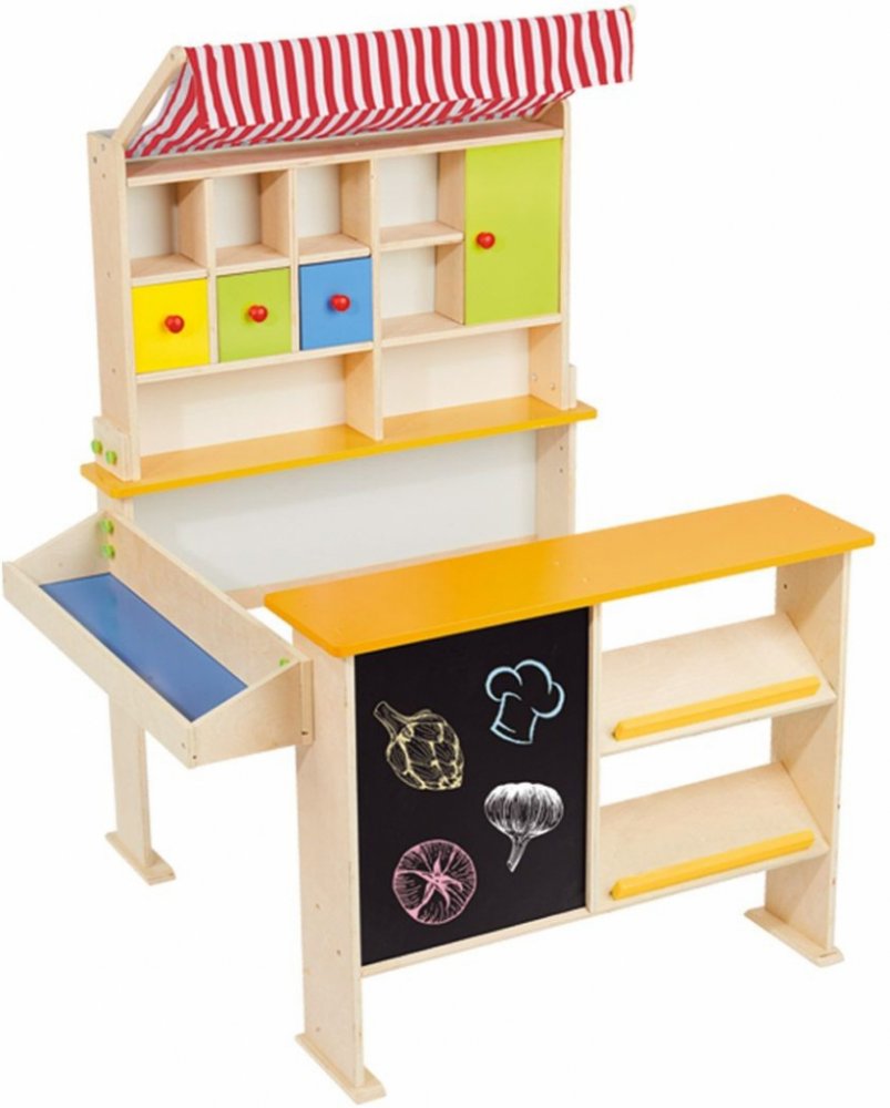 Playtive® Dřevěný obchod Rozvíjí fantazii, kreativitu a možnost osvojit si nové dovednosti prostřednictvím hry Stabilní dřevěná konstrukce s prodejním pultem, markýzou; postranním pultem, výlohou; 3 zásuvkami a posuvnými dveřmi ovatelná prodejní tabule včetně 5 barevných kříd a houby Kombinovatelný s dalšími sadami od značky Playtive Včetně nástěnného držáku pro bezpečnou hru Obsah balení: Markýza...
