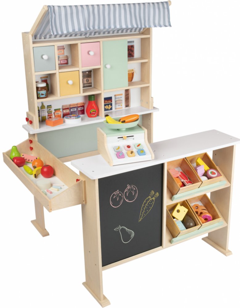 Playtive® Dřevěný obchod Rozvíjí fantazii, kreativitu a možnost osvojit si nové dovednosti prostřednictvím hry Stabilní dřevěná konstrukce s prodejním pultem, markýzou; postranním pultem, výlohou; 3 zásuvkami a posuvnými dveřmi ovatelná prodejní tabule včetně 5 barevných kříd a houby Kombinovatelný s dalšími sadami od značky Playtive Včetně nástěnného držáku pro bezpečnou hru Obsah balení: Markýza Prodejní pult Výloha Boční pult 3 zásuvky a posuvné dveře ovatelná tabule 5 barevných kříd Houba Doporučený věk: pro děti od 3 let Materiál Překližka, borovicové dřevo, plast, polyester Rozměry cca 83 x 110 x 75 cm (Š x V x H) Hmotnost cca 9,3 kg Upozornění Nevhodné pro děti mladší 36 měsíců. Nebezpečí udušení v důsledku vdechnutí nebo spolknutí malých dílů.