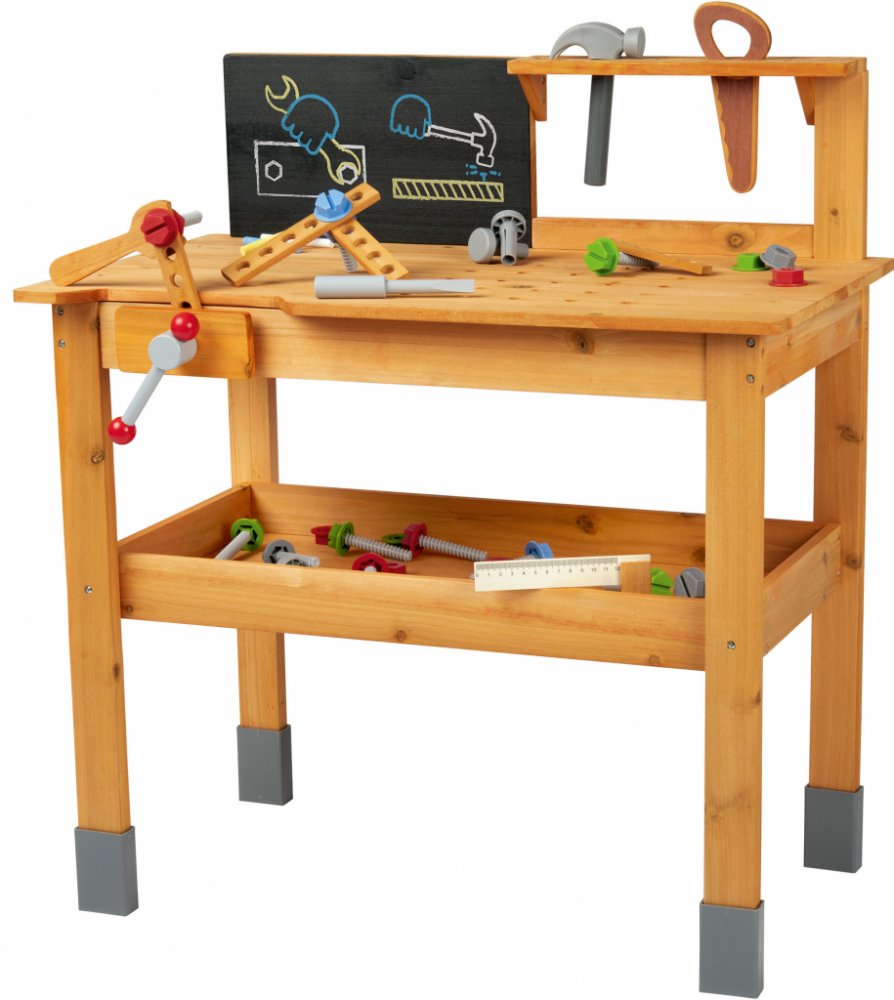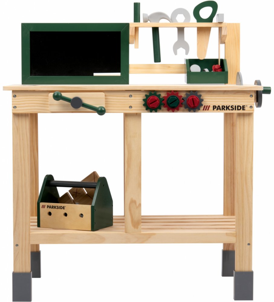 Playtive Venkovní dřevěný ponk Kreativní zábava pro malé kutily Podporuje jemnou motoriku a porozumění technice a inženýrství Realistické nástroje 25 symetricky rozmístěných otvorů v pracovní desce Otíratelná tabule se 3 kusy křídy 4 výškově nastavitelné nožky Včetně kufříku na nářadí Doporučený věk: pro děti od 3 let 69dílná sada Materiál Čínský smrk, plast Rozměry Rozměry pracovního stolu: cca 7...