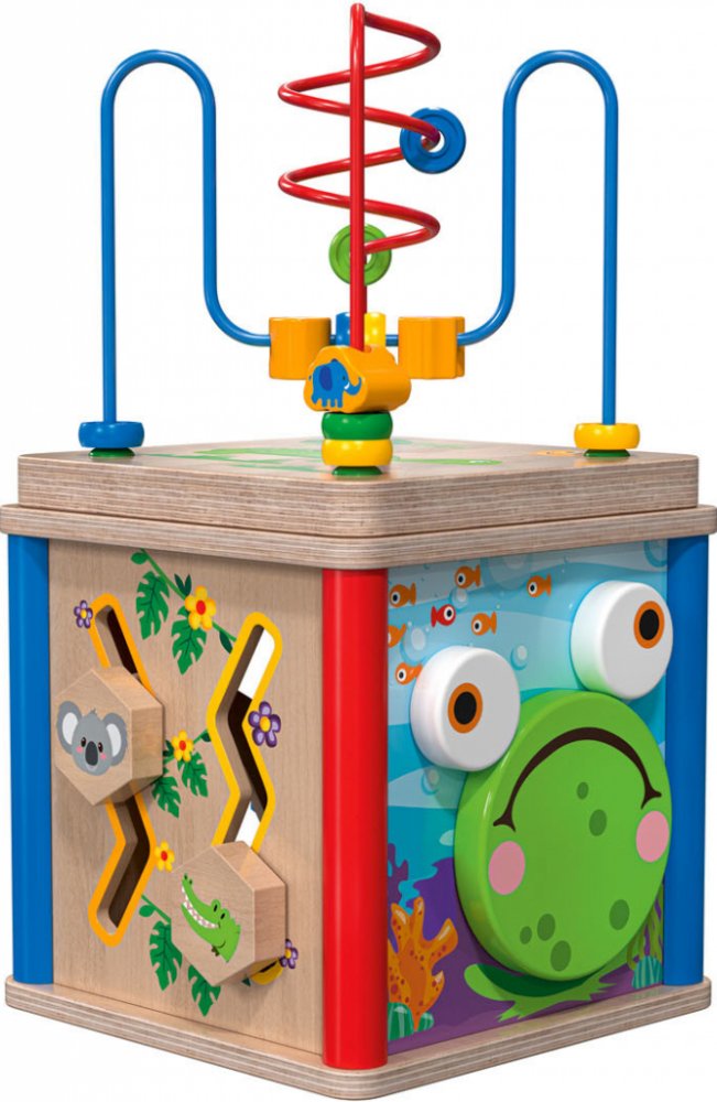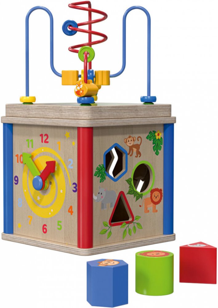 Hra na xylofon s kladívkem Z pravého dřeva Podporuje koordinaci rukou a očí a jemnou motoriku 3 barevné dřevěné koule a kladívko Vyjímatelný xylofon Doporučený věk: od 1 roku 6dílná sada Ponk na zatloukání Z pravého dřeva Podporuje koordinaci rukou a očí, zručnost a jemnou motoriku 8 dřevěných hřebíků a kladívko Naklápěcí mechanika: jeden hřebík dovnitř – druhý hřebík ven Doporučený věk: od 1 roku 2dílná sada Želva na tahání Z pravého dřeva Podporuje rozeznávání tvarů, logické myšlení a jemnou motoriku Odnímatelný váleček s otvory pro tvarované kostky Bubínek a hlava želvy se při tažení pohybují Doporučený věk: od 18 měsíců 8dílná sada Hrací kostka Podporuje dovednost, logické myšlení a prostorovou představivost 5 napínavých, naučných her z pravého dřeva Barevná, spirálová dráha – složitelná do kostky Otočná žába Barevné hodiny na učení Doporučený věk: od 1 roku 5dílná sada Zvuková hra žába Z pravého dřeva a odolné umělé hmoty Podporuje kreativitu, logické myšlení a první chápání hudby Napínavá hra s hudbou Vložení dřevěných prvků vyvolává různé tóny 10 známých melodií Včetně baterií Doporučený věk: od 1 roku 5dílná sada Hmotnost cca 900 g