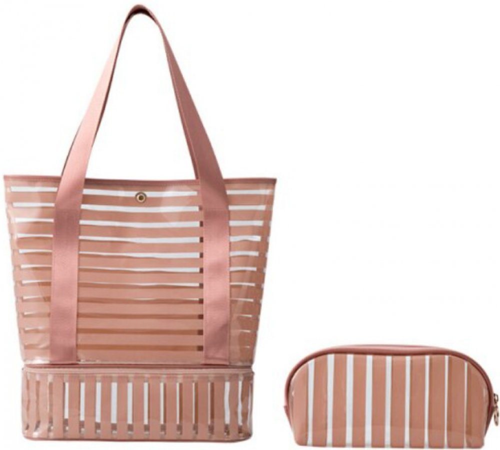 Dámská plážová taška z plastu, se zapínáním na magnet. Spodní část tašky lze otevřít samostatně zipem. Přehledně do ní uložíte všechny potřeby a při cestě z pláže nepropustí vlhkost. Součástí tašky je taštička na kosmetiku ze stejného materiálu, o rozměru 21 x 5 cm.