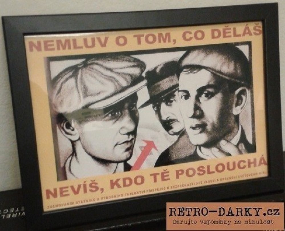 Text: Nemluv o tom co děláš, nevíš kdo tě poslouchá. Zachováním státního a výrobního tajemství přispěješ k bezpečnosti své vlasti a upevnění světového míru