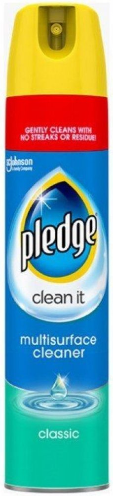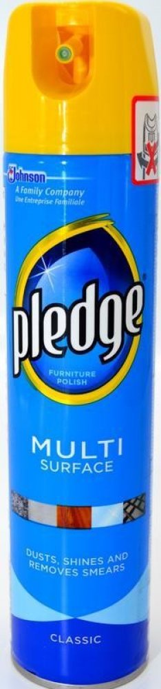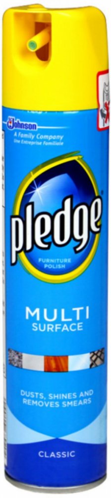 Obsahuje antistatické složky, které zabraňují opětovnému usazování prachu. Návod k použití: Vždy si nejdříve přečtěte návod k použití. Neotáčejte krytem. Před použitím dobře protřepejte. Nejdříve otestujte na malém kousku čištěné plochy, aby byla zajištěná snášenlivost s čištěným povrchem. Láhev držte ve svislé poloze,mírně nakloněnou, přibližně ve vzdálenosti 15 cm směrem k čištěnému povrchu nebo nastříkejte na hadřík a hned otřete. Výsledek můžete zdokonalit tím, že místo vyleštíte měkkým hadříkem do sucha. Nepoužívejte na podlahy nebo na vnitřní část vany, mohl by způsobit uklouznutí. Není vhodné používat na neošetřené dřevo. Bezpečnostní pokyny: Uchovávejte mimo dosah dětí. nádobka je pod tlakem. Nevystavujte slunečnímu záření a teplotám nad 50°C. Používejte jen v dobře odvětrávané místnosti. Nestříkejte do otevřeného ohně nebo na žhavé předměty. Uchovávejte mimo dosah zdrojů zapálení - Zákaz kouření. Ani vyprázdněnou nádobku neprorážejte a nevhazujte do ohně. 10% náplně je hořlavých. Výrobcem značky Pledge je společnost SC Johnson, která vyrábí také Pronto.