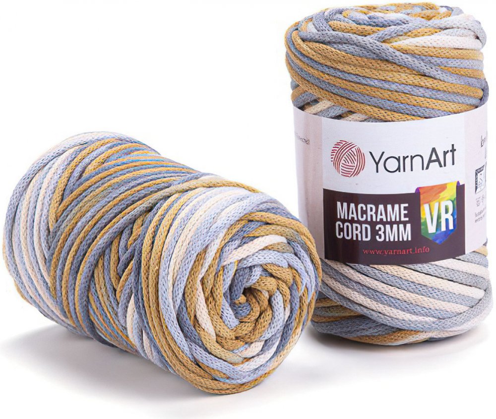 Macrame směsová pletací / háčkovací příze (60% Bavlna - 40% Polyester a viskóza) v melírované hořčicovo-šedé barvě. Šňůrky macrame jsou krásně tkané, velmi jemné a hladké na omak. Díky přídavku polyesteru získávají šňůry prvotřídní kvalitu a odolnost. Tato příze je ideální k háčkování například pufů, koberců, podložek, prostírání, košů, košíčků, obalů, batohů, tašek a kabelek a mnoho dalších doplň...