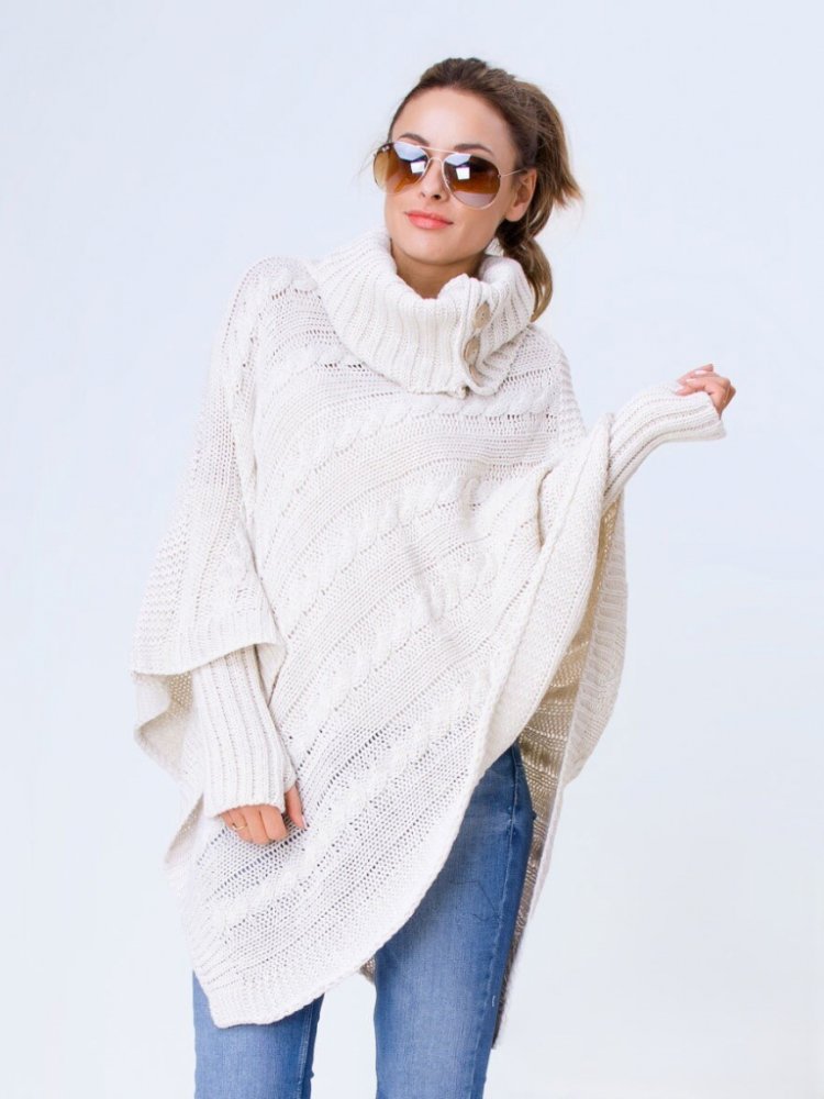 Krásné klasické pončo v krémové barvě. Pončo má vysoký límec, který je zdobený knoflíky, které si můžete kdydoliv odepnout. Pončo zahrnuje i rukavice, které jsou ve stejné barvě, dlouhé 45cm. MATERIÁL: 100% akryl ROZMĚRY: Délka: cca 95 cm Šířka: 100 cm tolerance +/- 2 cm