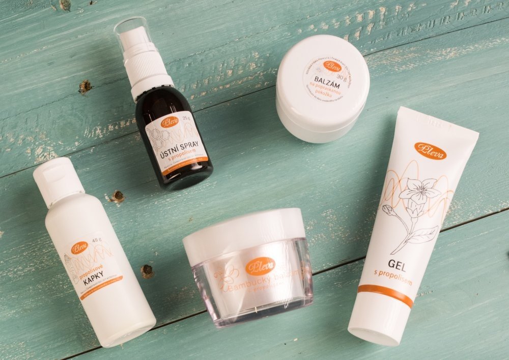 Pleva Cestovní lékárnička Gel s propolisem 50 g Bambucký balzám s propolisem 30 g Ústní spray s propolisem 25 g Balzám na popraskanou pokožku 30 g Propolisové kapky (tinktura) 48 g