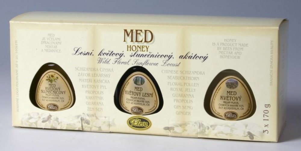 „Hledáte-li vhodný dárek pro někoho, kdo ocení poctivý český produkt, rád si pochutná, ale zároveň myslí na své zdraví, nemůžete s dárkovou krabičkou plnou lahodného medu udělat chybu. Medové dárkové balení obsahuje 3 malé medíky.“