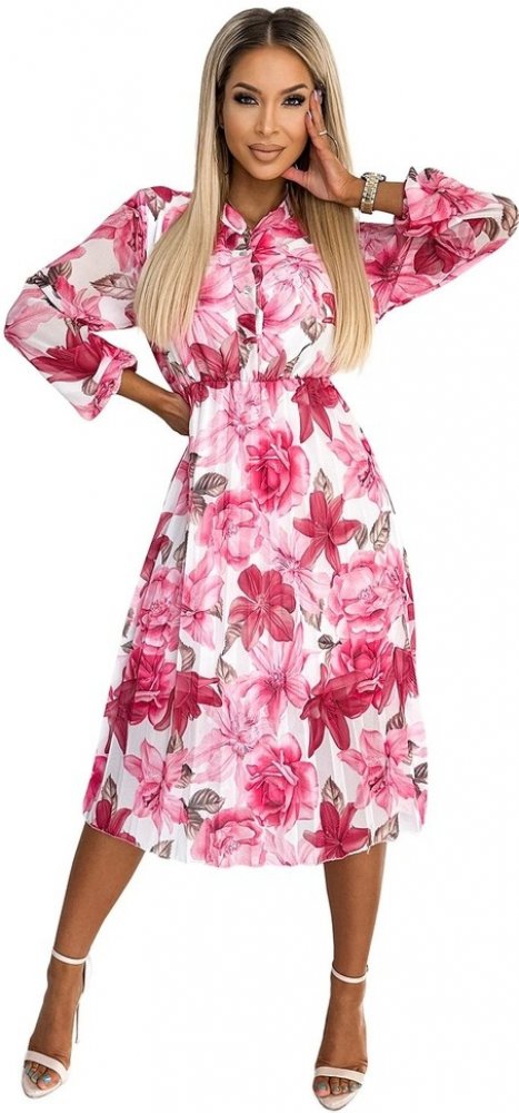 CARLA - šifonové plisované midi šaty s knoflíky a dlouhými rukávy. Vzor: tmavě růžové květy na bílém pozadí. Značka Numoco. Evropská výroba.