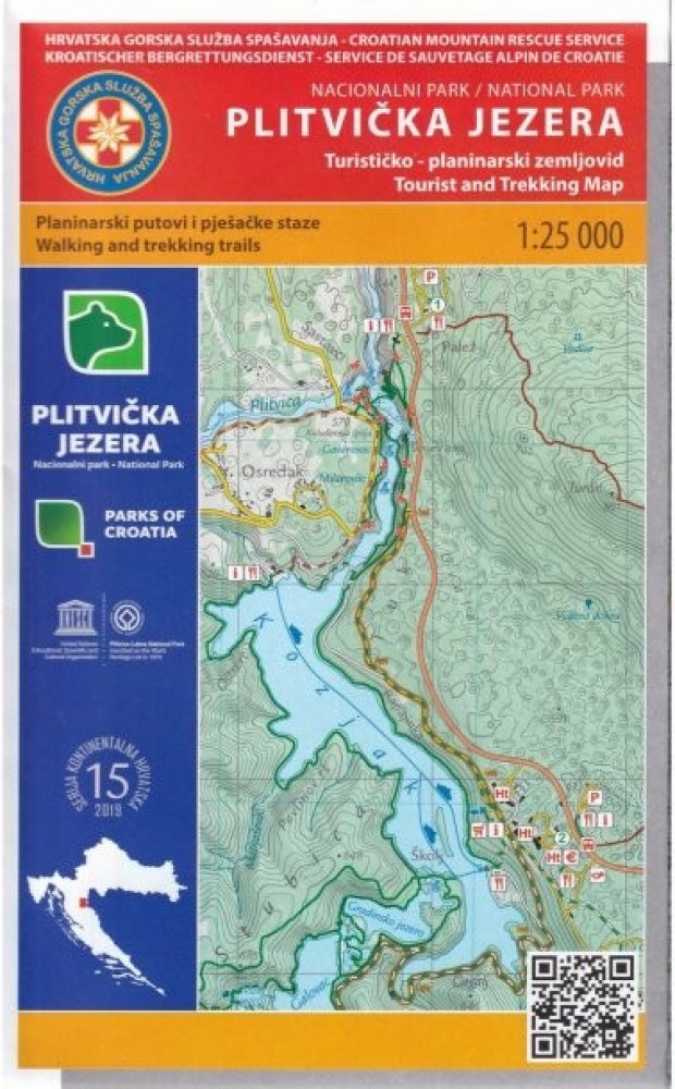 Jednostranná mapa oblasti Plitvických jezer v měřítku 1:25 000. Výškopis znázorněn pomocí stínování, vrstevnic po 10 metrech a výškových kót. Z vegetačního povrchu rozlišen les a otevřená krajina. Dále zobrazena sídla, silniční síť, železniční síť, vodopis, značené pěší turistické trasy, cyklotrasy. Mapa je bohatá na symboly, které zobrazují turisticky zajimavá či užitečná místa jako např.: horské...