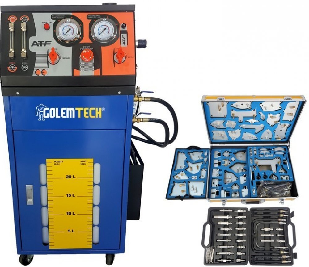 Pneumatický přístroj pro výměnu oleje v automatických převodovkách - ATF a vyčištění systému. Dipstick systém pro použití v uzavřených převodovkách a použití aditiv. Součástí je speciální rozšířená sada 86 ks připojovacích adapterů.