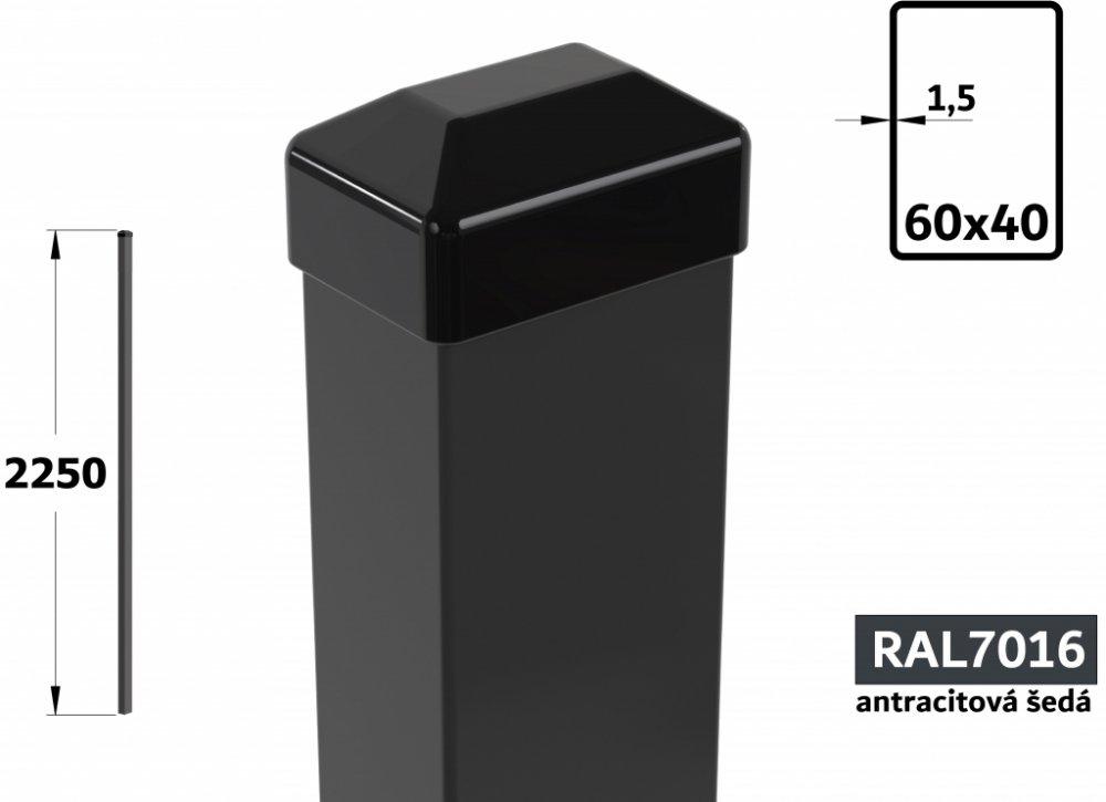 Pro výšku plotu cca 180 cm, celková délka 225 cm, obdélníkový profil 60x40 mm, včetně horní krytky. Pozinkovaný + poplastovaný, antracitová barva.