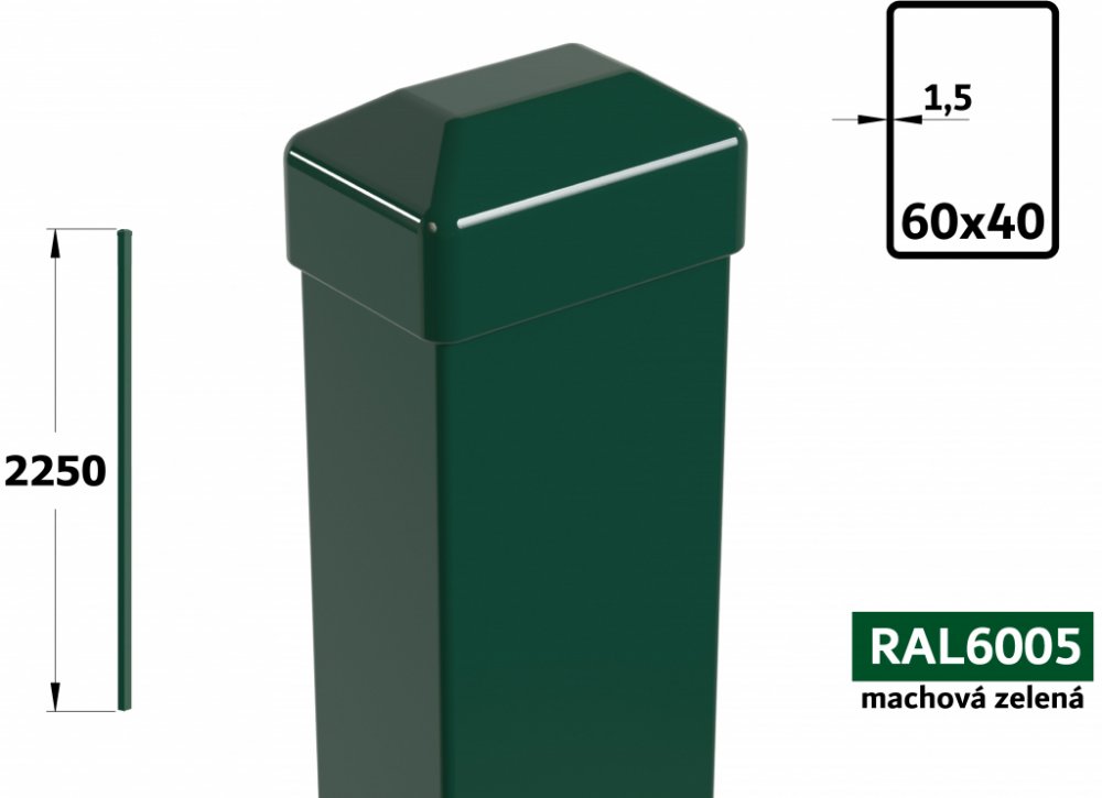 Pro výšku plotu cca 180 cm, celková délka 225 cm, obdélníkový profil 60x40 mm, včetně horní krytky. Pozinkovaný + poplastovaný, zelená barva.
