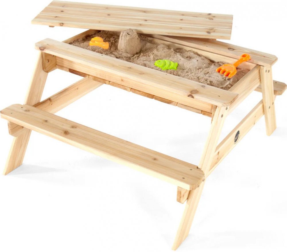 Dřevěný piknikový stůl 2v1 je prostorově úsporný stůl vhodný pro venkovní použití. Složením vrchní desky, která slouží k psaní a kreslení, vznikne plocha pro hru s pískem. Dřevěný piknikový stůl s lavičkami a pískovištěm je vyroben z robustního dřeva čínské jídlo s certifikátem FSC. Dřevo je ošetřeno před povětrnostními vlivy. Písek není součástí balení. K naplnění pískoviště je potřeba cca 30 kg ...