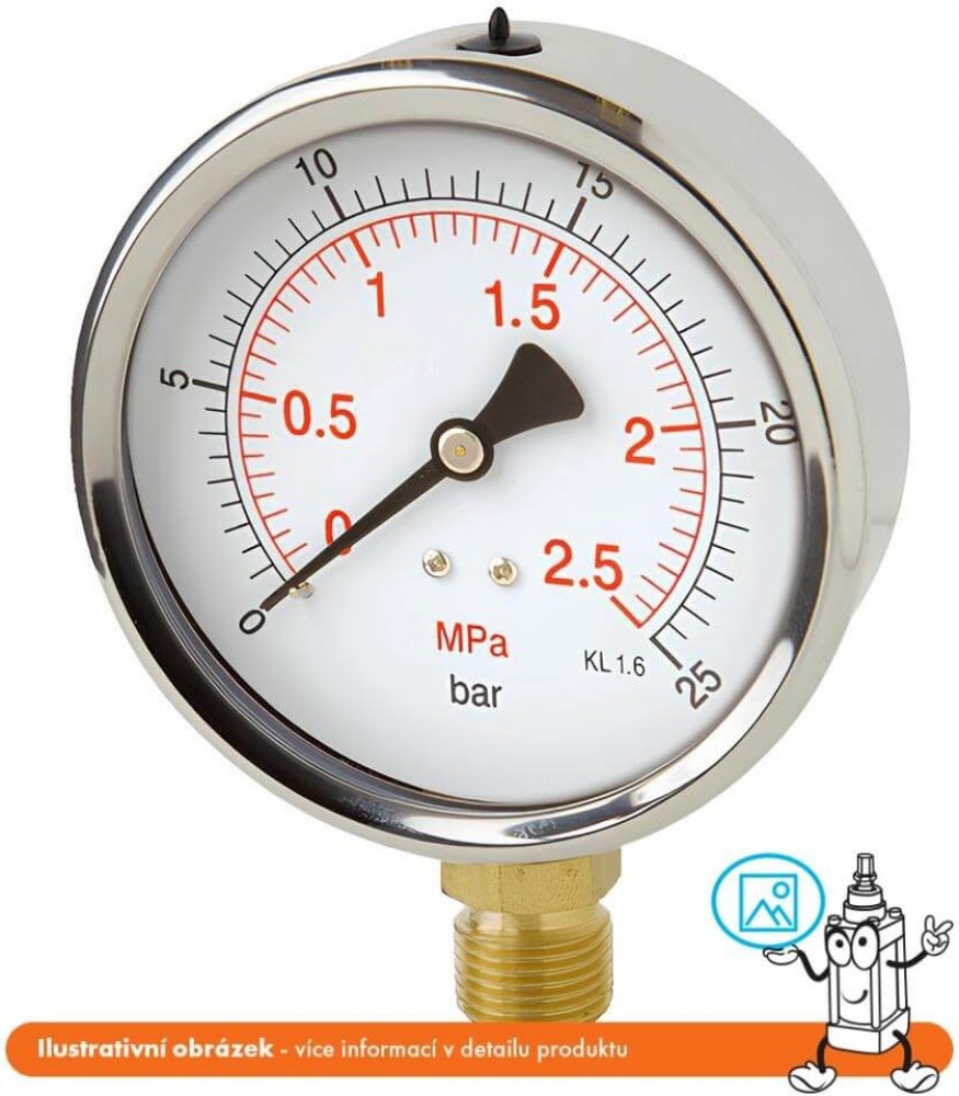 - Dvojitá stupnice v bar a kPa/MPa, třída přesnosti 1,6%