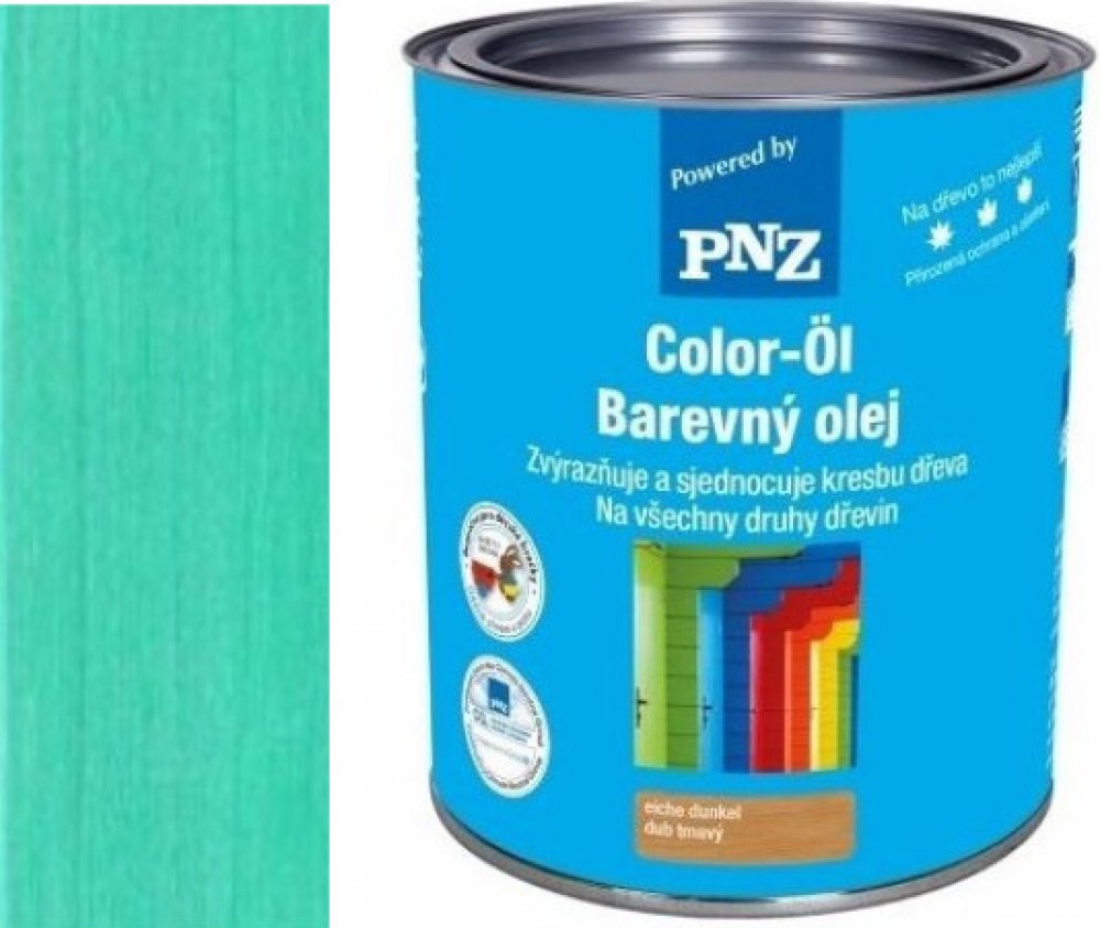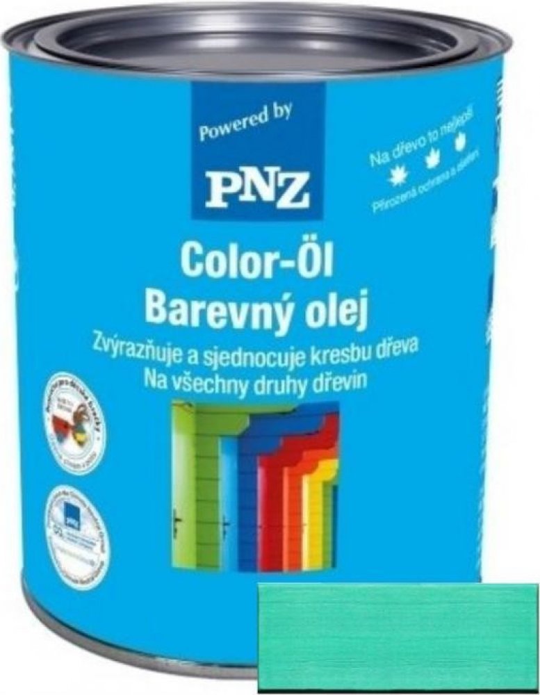 PNZ Barevný olej je zabarvený olej na dřevo na přírodní bázi, bez obsahu rozpouštědel. Vytváří velmi trvanlivý ochranný nátěr pro vnitřní a venkovní použití s vynikajícím hloubkovým pronikáním. Výroba vychází z desítky let starých tradičních receptur. Lze použít na nové dřevo i starší soudržné nátěry. Výtěžnost je dvojnásobná oproti běžným lazurovacím nátěrům. Vynikající zasíťovací vlastnosti, zřetelně delší životnost a vysoká ochrana proti UV záření je dána použitím nanotechnologie. Má nestékavou úpravu, je elastický a vlhkostně regulační. Snižuje praskání, bobtnání a ubývání dřevní hmoty.