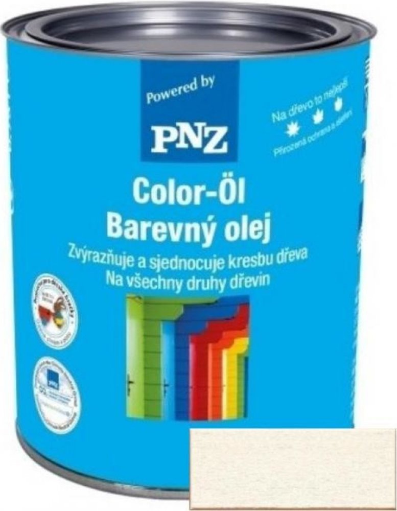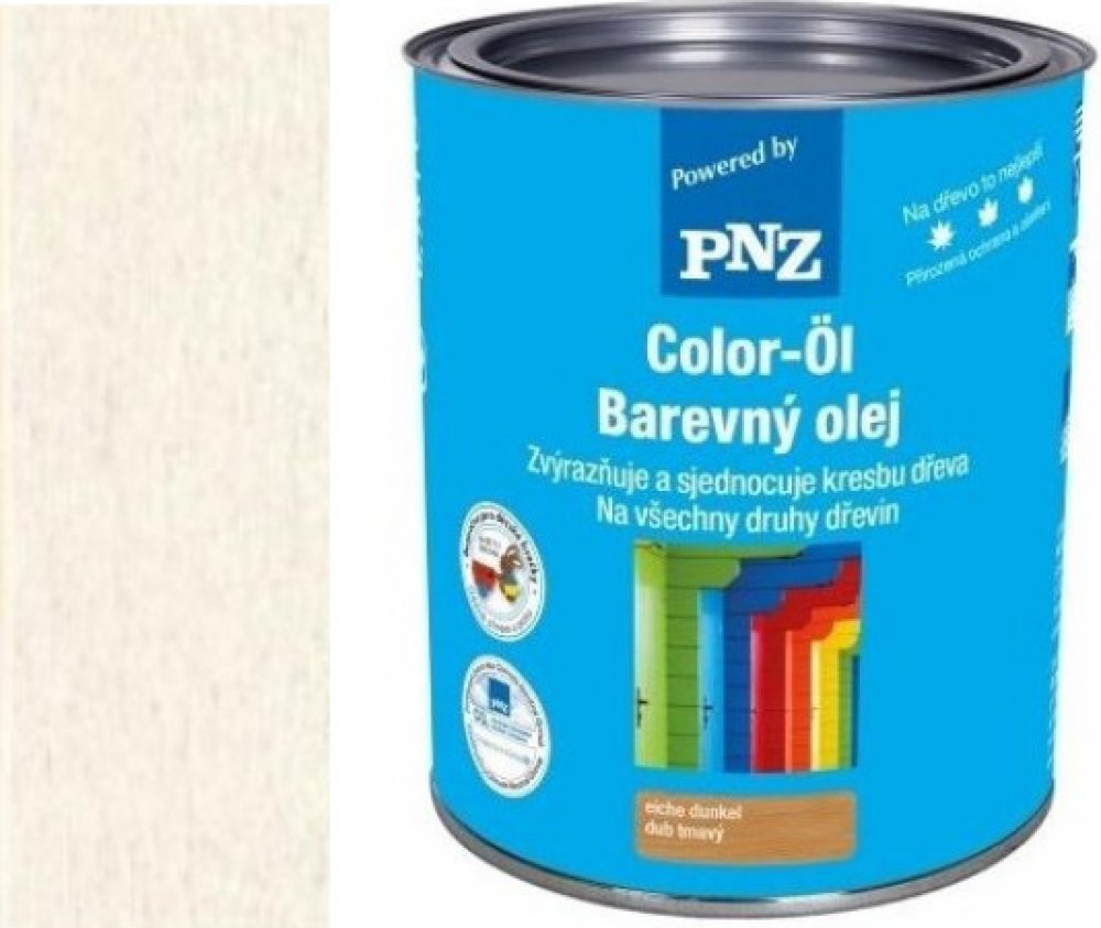 PNZ Barevný olej je zabarvený olej na dřevo na přírodní bázi, bez obsahu rozpouštědel. Vytváří velmi trvanlivý ochranný nátěr pro vnitřní a venkovní použití s vynikajícím hloubkovým pronikáním. Výroba vychází z desítky let starých tradičních receptur. Lze použít na nové dřevo i starší soudržné nátěry. Výtěžnost je dvojnásobná oproti běžným lazurovacím nátěrům. Vynikající zasíťovací vlastnosti, zřetelně delší životnost a vysoká ochrana proti UV záření je dána použitím nanotechnologie. Má nestékavou úpravu, je elastický a vlhkostně regulační. Snižuje praskání, bobtnání a ubývání dřevní hmoty.