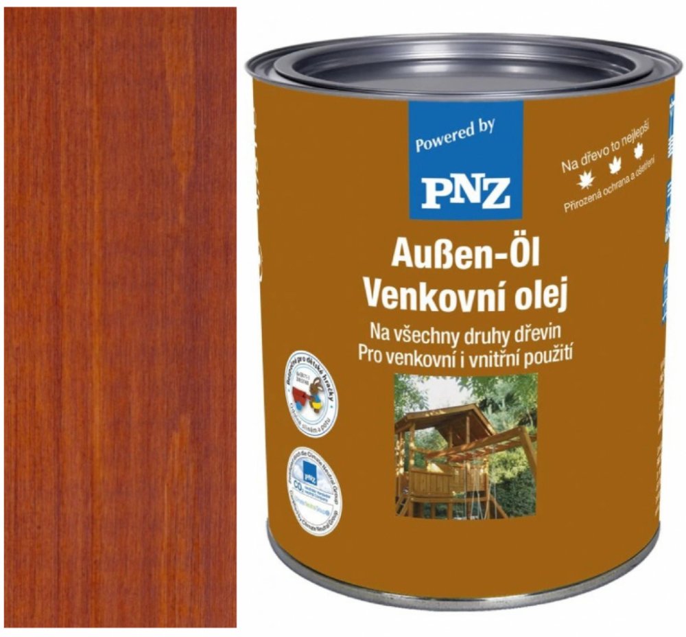 Charakteristika: Barevný PNZ Venkovní olej je vyráběn podle staletých receptur a používá se především v exteriéru. Nátěr netvoří souvislý film a poskytuje ochranu před extrémními povětrnostními vlivy. Na rozdíl od nátěrů tvořících souvislou vrstvu, se PNZ Venkovní olej usazuje pevně v kapilárách dřeva a poskytuje tak dřevu přírodní ochranu, odolnou povětrnostním vlivům, vodě a UV záření. Zabraňuje bobtnání, vysychání a praskání dřeva.