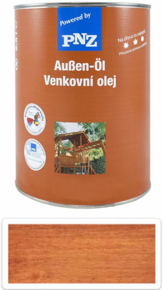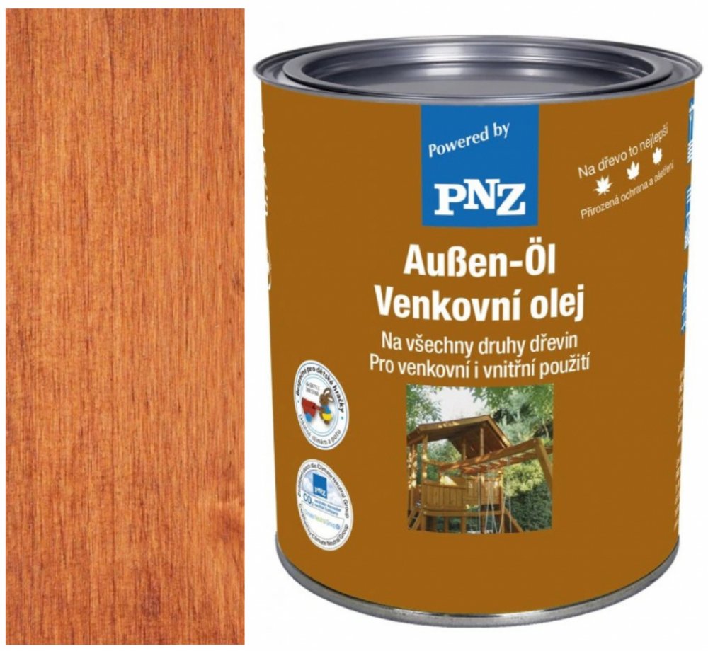 Barevný PNZ Venkovní olej je vyráběn podle staletých receptur a používá se především v exteriéru. Nátěr netvoří souvislý film a poskytuje ochranu před extrémními povětrnostními vlivy. Na rozdíl od nátěrů tvořících souvislou vrstvu, se PNZ Venkovní olej usazuje pevně v kapilárách dřeva a poskytuje tak dřevu přírodní ochranu, odolnou povětrnostním vlivům, vodě a UV záření. Zabraňuje bobtnání, vysychání a praskání dřeva.