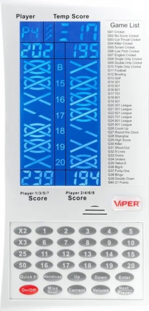 Počítadlo stavu Viper ProScore TouchpadViper ProScore má funkce, které běžně naleznete na elektronických terčích. S tímto malým šikovným pomocníkem při hraní steel šipek už nemusíte nic psát a počítat.