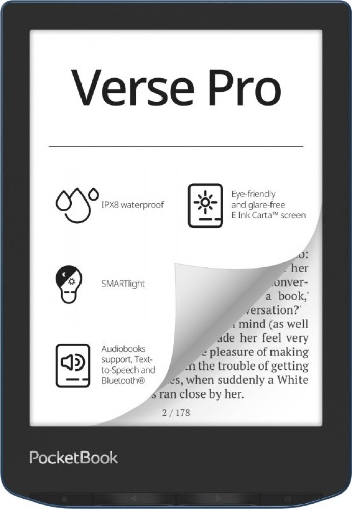 Čtečka e-knih PocketBook 634 Verse PRO vás ohromí svou vysokou odolností proti vodě se stupněm krytí IPX8. Tato kompaktní a lehká čtečka vám přináší nejmodernější funkce a technologie v elegantním a pohodlném balení. Je určena pro čtení elektronické verze tištěných knih, poslechu hudby a Audioknih. Je vybavena 6palcovým displejem E Ink Carta™ HD s optickými vlastnostmi tak blízkými běžné tištěné stránce knihy, jak je to jen možné. Technologie SMARTlight umožňuje přizpůsobení jasu a teploty barev obrazovky. Protože displej odráží denní světlo, je možné během dne číst i bez podsvícení. Díky vysoce výkonnému dvoujádrovému procesoru si tato čtečka poradí s jakýmkoli úkolem velmi rychle. Je neuvěřitelně ergonomická a lehká; hmotnost jen 186 gramů z něj činí ideální zařízení pro každodenní čtení, ať jste kdekoli. Podporuje 20 nejpopulárnějších formátů knih a 4 formáty grafiky, včetně formátů komiksů CBR a CBZ. Vnitřní paměť 16GB plus slot pro paměťové microSD a SDHC karty (až do velikosti 32 GB) umožňují stažení tisíců elektronických knih. Kromě toho bsahuje dostupné online služby jako PocketBook Cloud, ReadRate, Dropbox PocketBook, Send-to-PocketBook. K nabíjení je možné použít jakoukoli nabíječku s micro USB konektorem, nebo můžete k nabití připojit čtečku k počítači pomocí přiloženého kabelu.