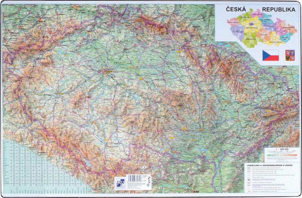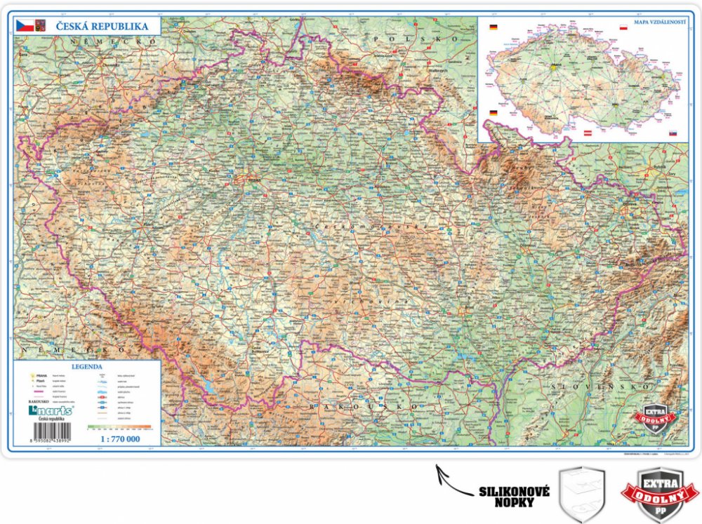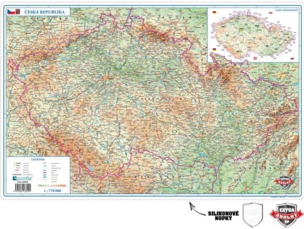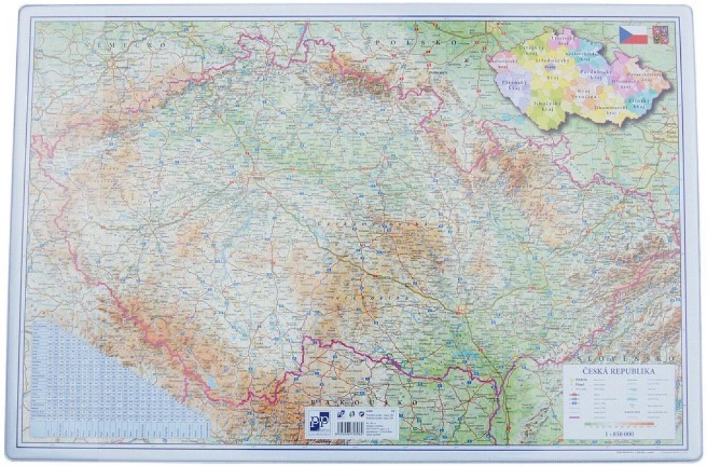 stolní podložka s motivem mapy ČR je vyrobená z vysoce odolného polypropylenu, na zadní straně je potištěna silikonovými nopky pro lepší přilnavost k desce psacího stolu, rozměr podložky je 60 x 39 cm . Novinka 7.2018