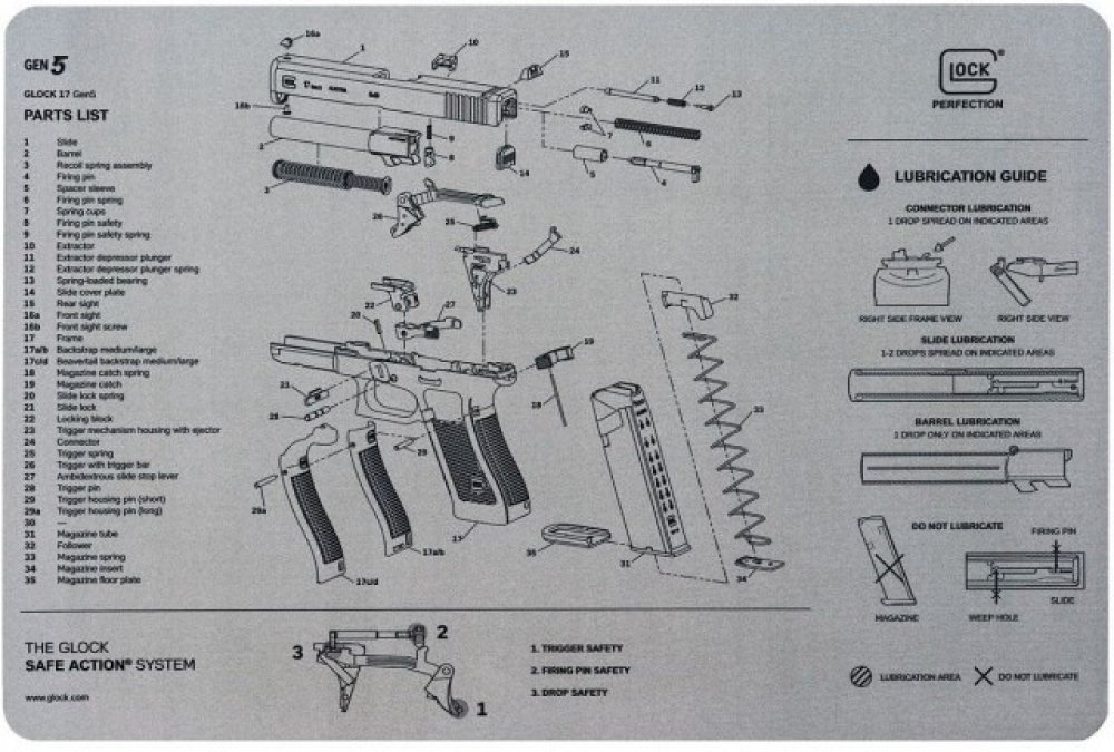 Podložka zbrojíře Glock Gen5 vám usnadní práci při rozborce a údržbě vaší zbraně. Podložka obsahuje nákres zbraně Glock 17 páté generace, včetně popisu míst, které je nutné pravidelně mazat a při údržbě je jim potřeba věnovat zvýšenou pozornost. Při rozborce vám rozhodně přijde vhod kompletní nákres zbraně, doplněný o seznam všech součástek a návod na složení.