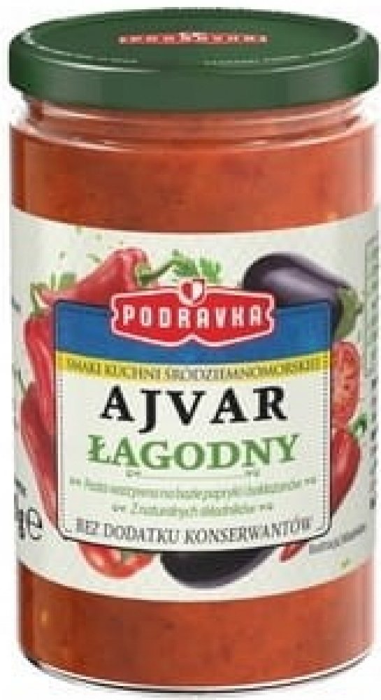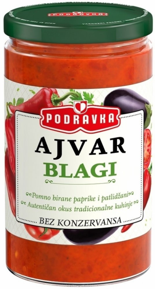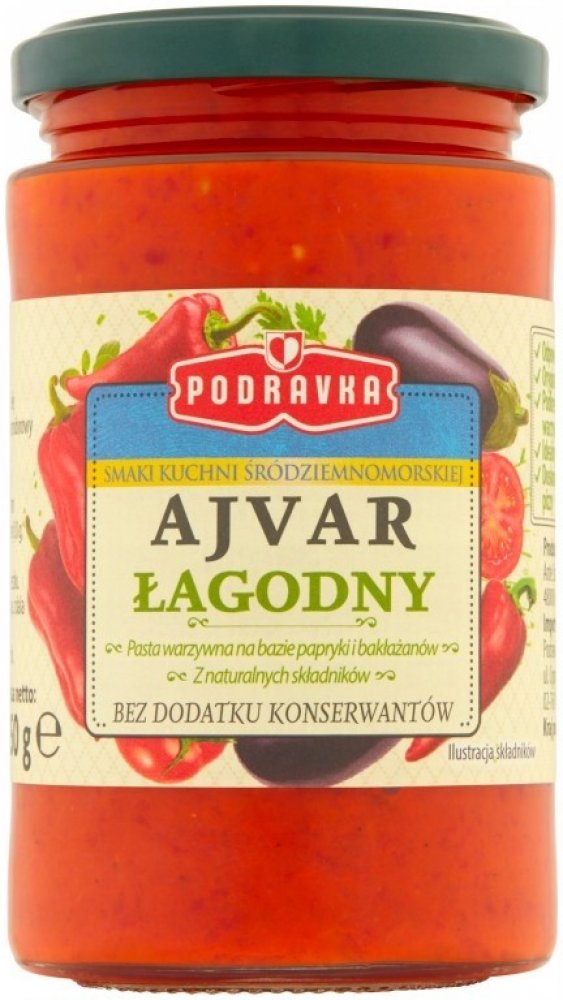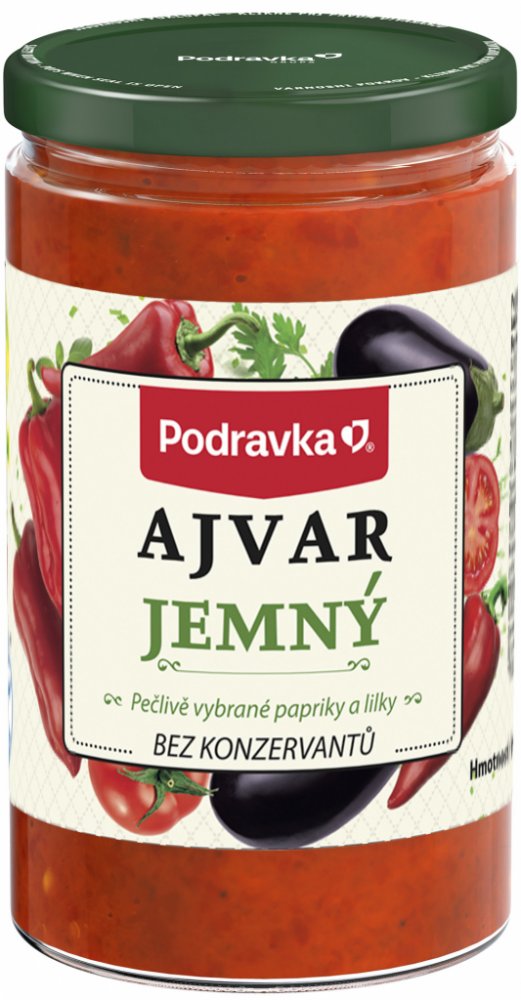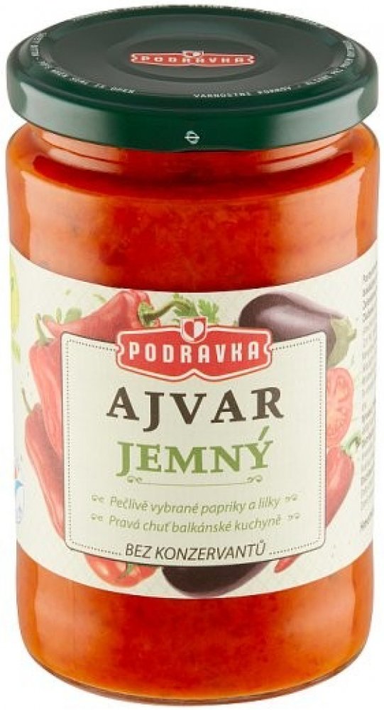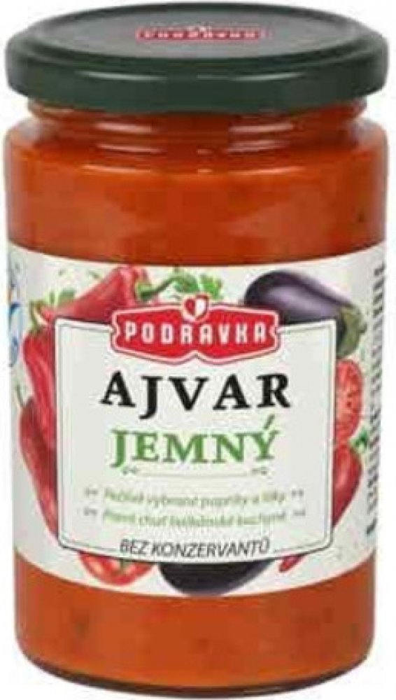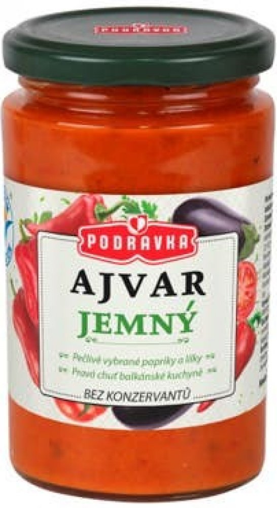 Ajvar je čistě zeleninová příloha z paprik a lilku dochucená směsí koření. Neobsahuje žádné přídatné látky.
