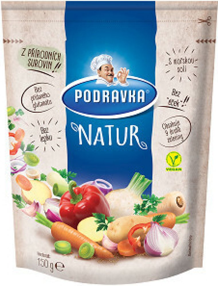 Vyzkoušejte nové složení přísady Natur! Na jeden balíček 150 g je použito 480 g čerstvé zeleniny, nově obsahuje pouze mořskou sůl, je v ní spousta bylinek a voňavého koření. Obsahuje pouze přírodní suroviny, neobsahuje žádná "éčka", ani glutaman sodný.