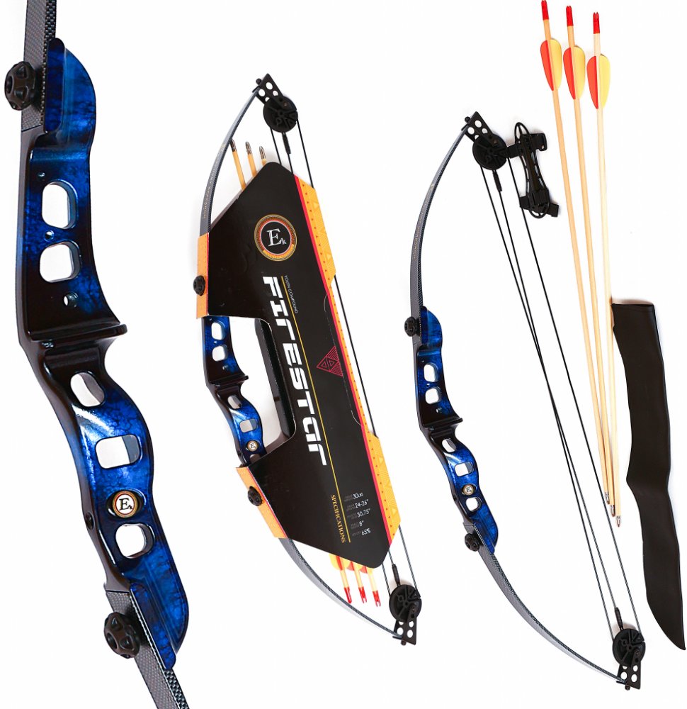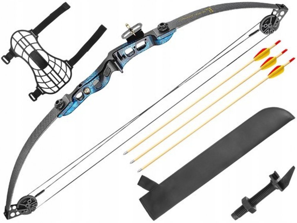 Sestava objahuje kladkový luk, mířidlo, plastovou základku, 3ks dřevěných šípů, toulec, chánič předloktí