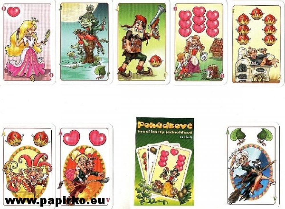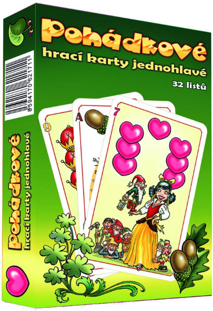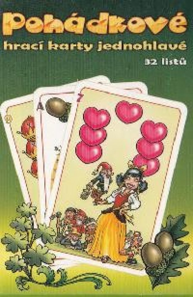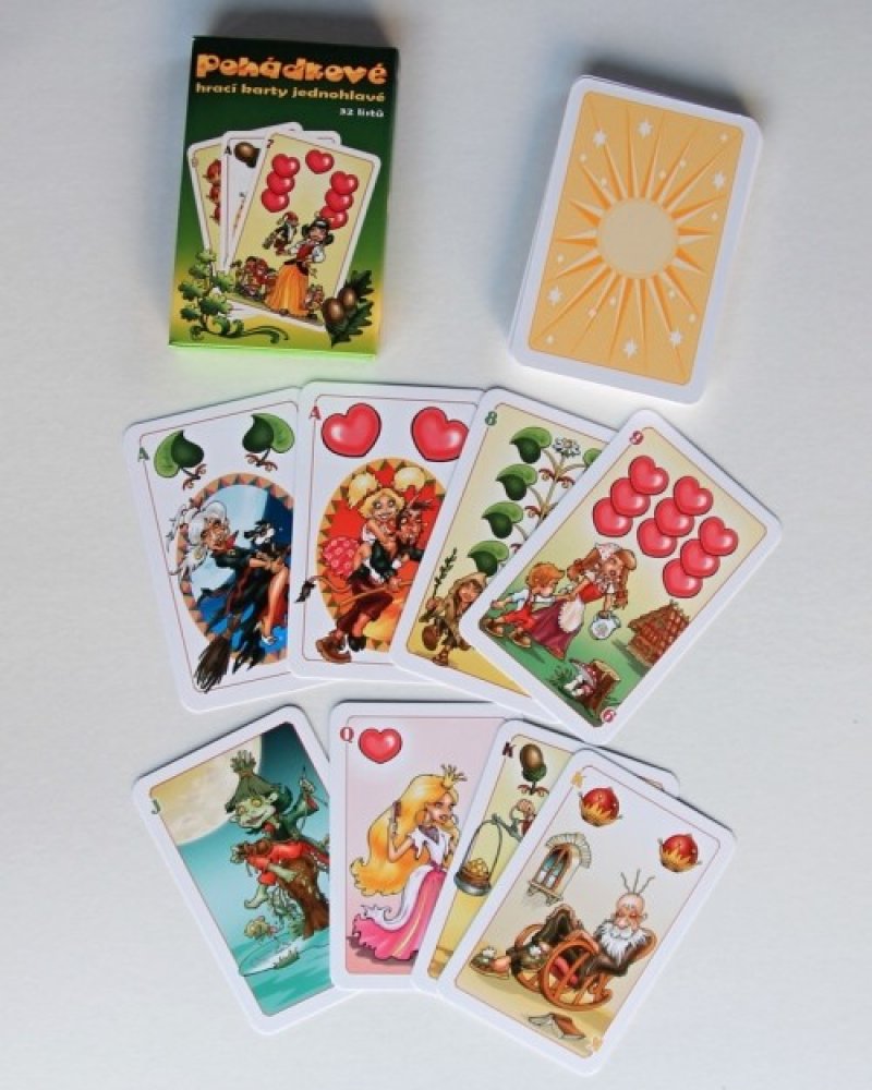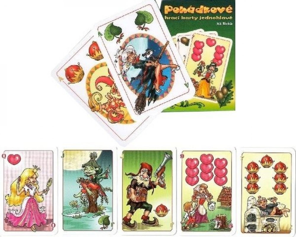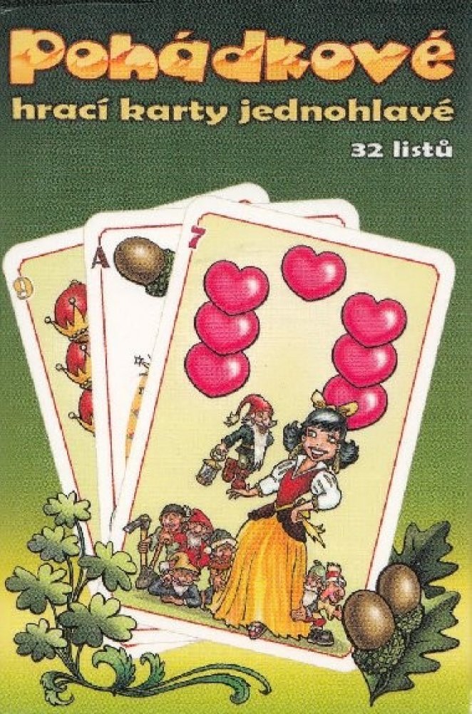 Jednohlavé karty v pohádkovém provedení vhodné pro hru Mariáš, Ferbl, Prší a další. Srdce, žaludy, listy a kule jsou doplněny obrázky z pohádek, jejich grafické ztvárnění je vhodnější spíše pro starší děti a dospělé. Balení: 32 karet v papírové krabičce