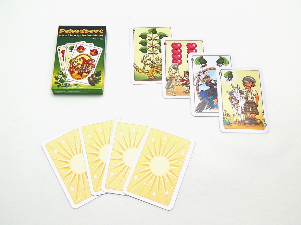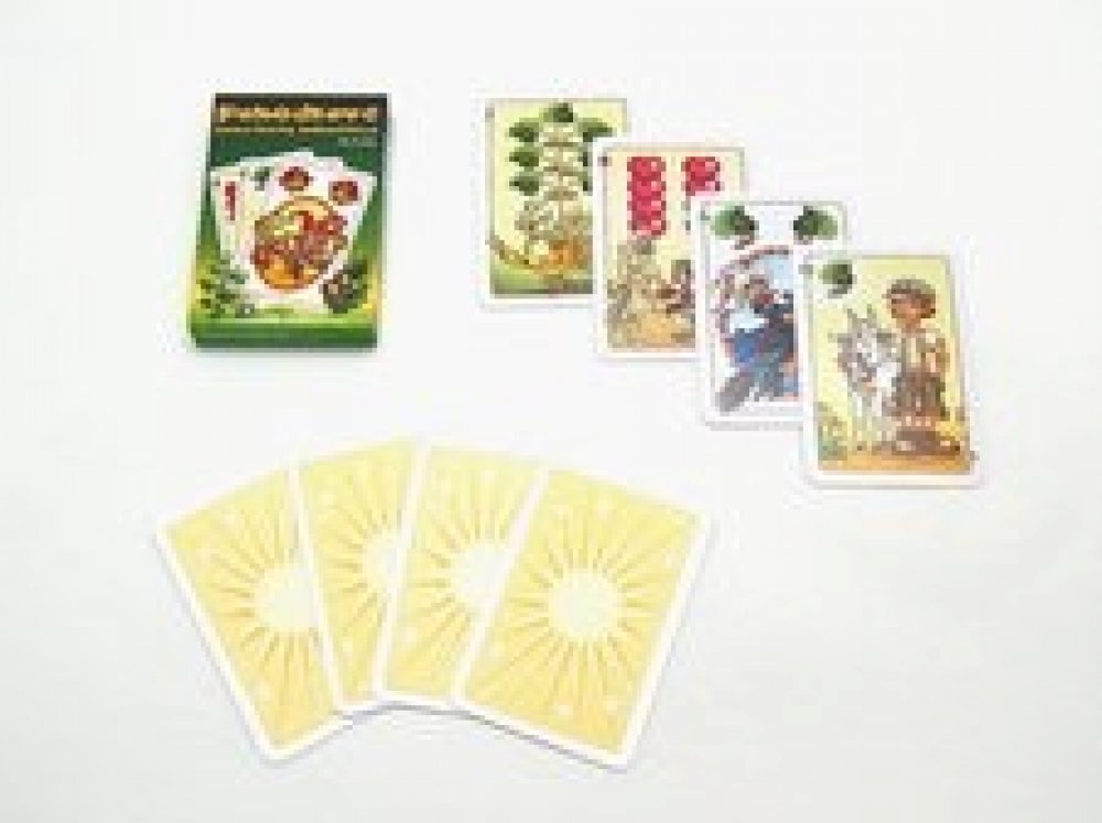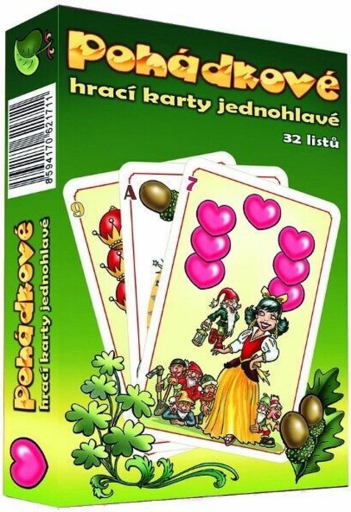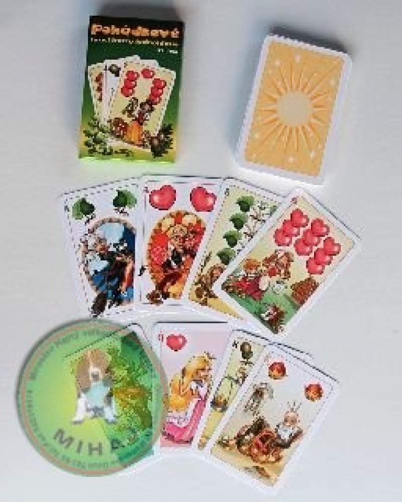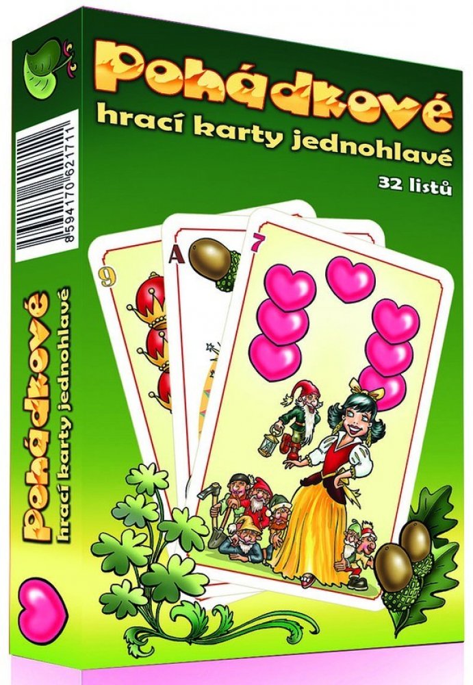 Jednohlavé karty v pohádkovém provedení vhodné pro hru Mariáš, Ferbl, Prší a další. Srdce, žaludy, listy a kule jsou doplněny obrázky z pohádek, jejich grafické ztvárnění je vhodnější spíše pro starší děti a dospělé. Balení: 32 karet v papírové krabičce