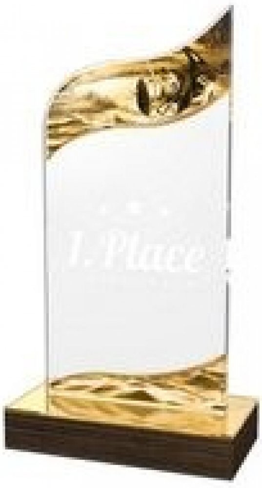 Akrylátová trofej na dřevěném podstavci se stříbrným akrylovým zrcadlem.
