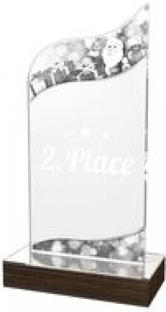 Akrylátová trofej na dřevěném podstavci se stříbrným akrylovým zrcadlem.