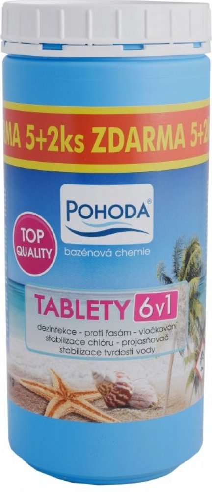 POHODA tablety 6 v 1 (dezinfekce, proti řasám, vločkování, stabilizace chlóru, projasňovač - zlepšuje funkčnost filtrace, stabilizace tvrdosti vody) je moderní víceúčelový přípravek pro celosezónní průběžnou údržbu vody ve všech typech bazénů. Likviduje baktérie a řasy, zabraňuje jejich růstu, umožňuje vyvločkování nečistot, stabilizuje aktivní chlór a tvrdost vody, projasňuje (zlepšuje efektivitu filtrace).