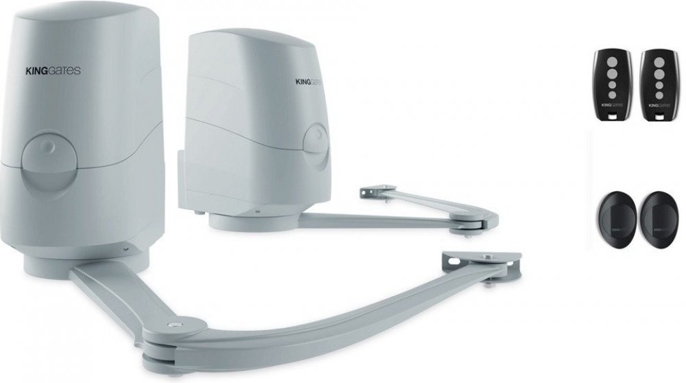 Sada pro dvoukřídlé brány: 2 pohony s kloubovým ramenem pro brány max. šířka listu 280cm a hmotnost 300kg. Sada obsahuje 2 dálkové ovladače a fotobuňky. Maximální odstavení 35cm. Koncový doraz z oceli.