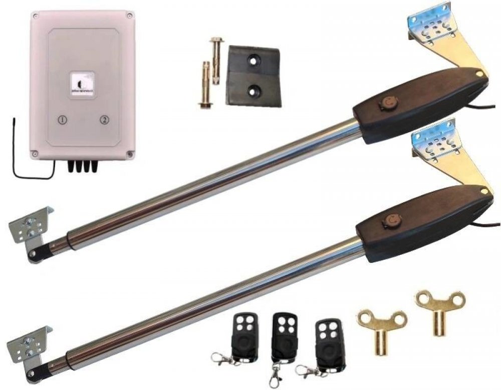 Obsah balení: 2ks pohonných motorů 24V, programovatelná řídící jednotka na 230V s displejem a transformátorem 230/24V, tři dálkové čtyřkanálové ovladače (s kovovým rámečkem a zajížděcí krytkou spínačů) s dosahem 50m z automobilu s plovoucím kodem, kovové pozinkované instalační příslušenství pro montáž (profily síly 6mm), gumový středový doraz pro pozici zavření křídla brány, 2ks odepínací klíče pro případ výpadku el. energie, podrobný návod na montáž, zapojení a nastavení v češtině (i s možností montáže ven z areálu).
