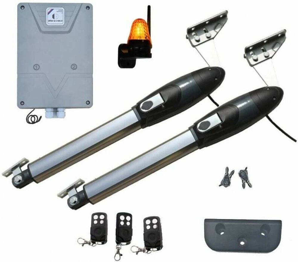 Obsah balení: 2ks pohonných motorů 24V, řídící jednotka na 230V s transformátorem 230/24V a s programovatelnou řídící jednotkou s displejem pro zobrazení nastavení, tři dálkové čtyřkanálové ovladače (s kovovým rámečkem a zajížděcí krytkou spínačů) s dosahem 50m z automobilu s plovoucím kodem, výstražný maják s možností nastavení blikání, nebo svícení, kompletní kovové pozinkované instalační příslušenství pro montáž (profily síly 6mm), gumový středový doraz pro pozici zavření křídla brány, 2ks odemykací klíče pro každé rameno, podrobný a srozumitelný návod na montáž, zapojení a nastavení v češtině (i s návodem montáže ven z areálu).