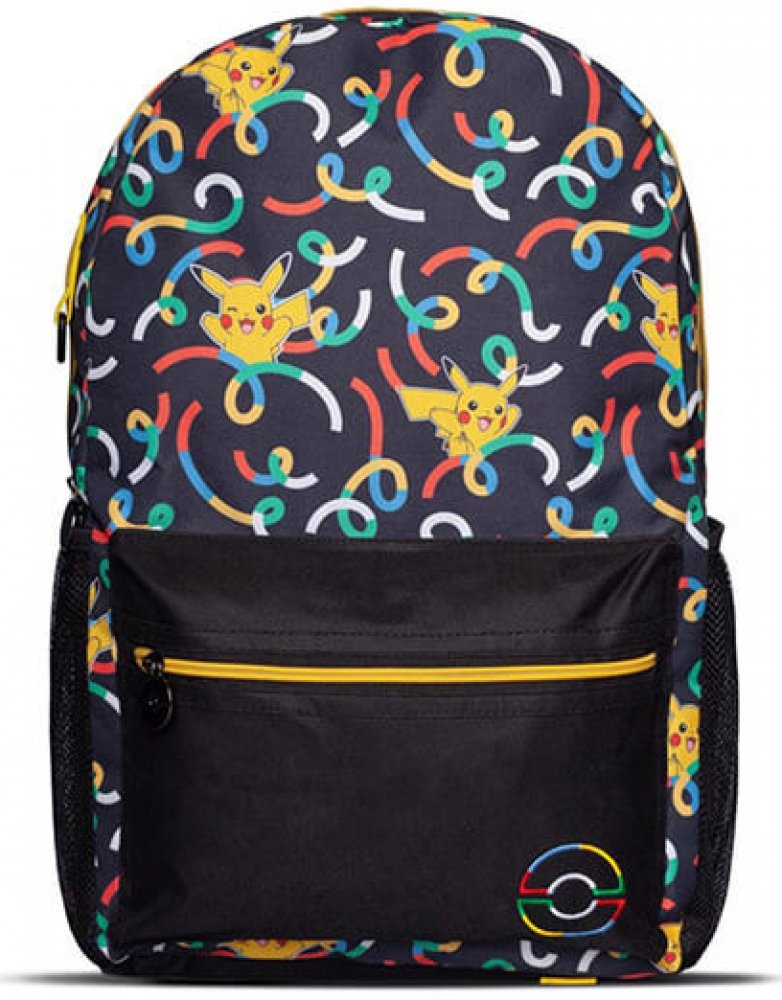 Pokémon batoh s černou podšívkou uvnitř a veselým Pikachu s konfety na vnější straně. Nechte se na výlet doprovázet oblíbenými Pokémony!
