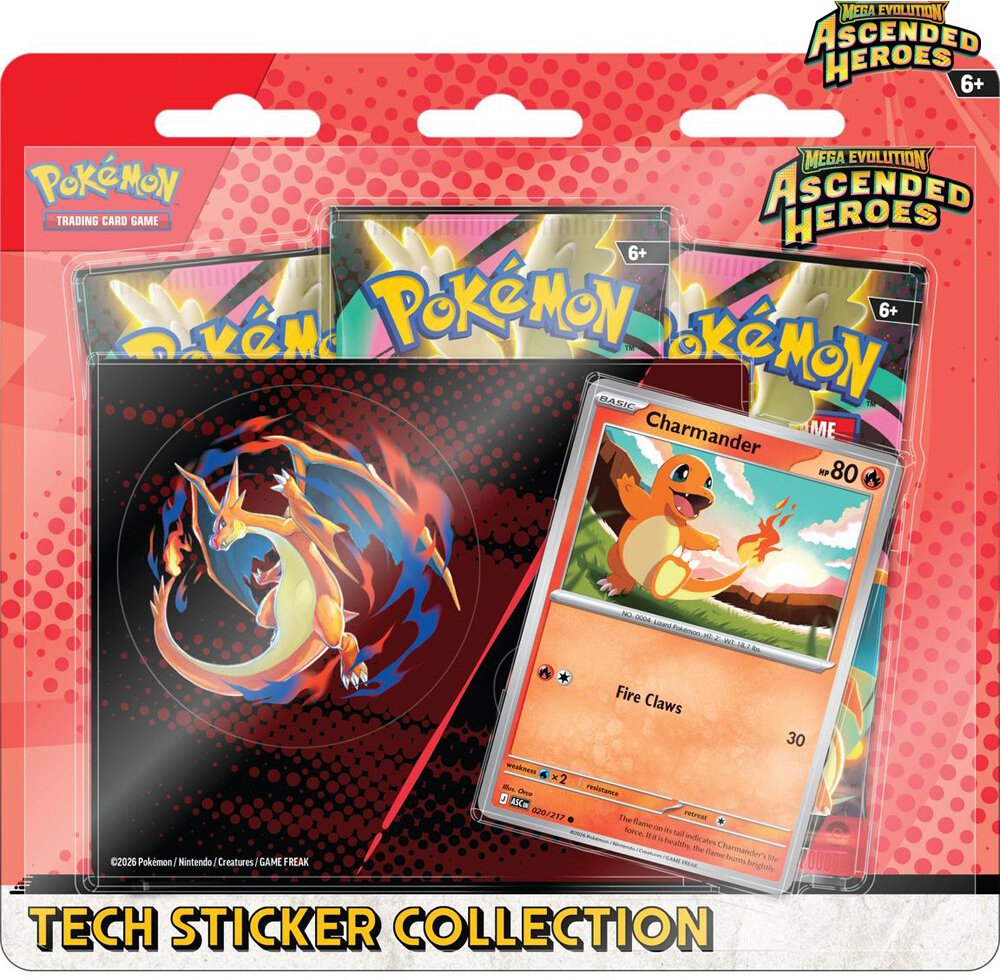 Pokémon Mega Evolution Ascended Heroes Charmander Tech Sticker Collection je zábavná a sběratelská sada zaměřená na Charmandera a Mega Charizard Y. Tento blister nabízí foil promo kartu, technické samolepky a boostery pro rozšíření sbírky a herní strategie.