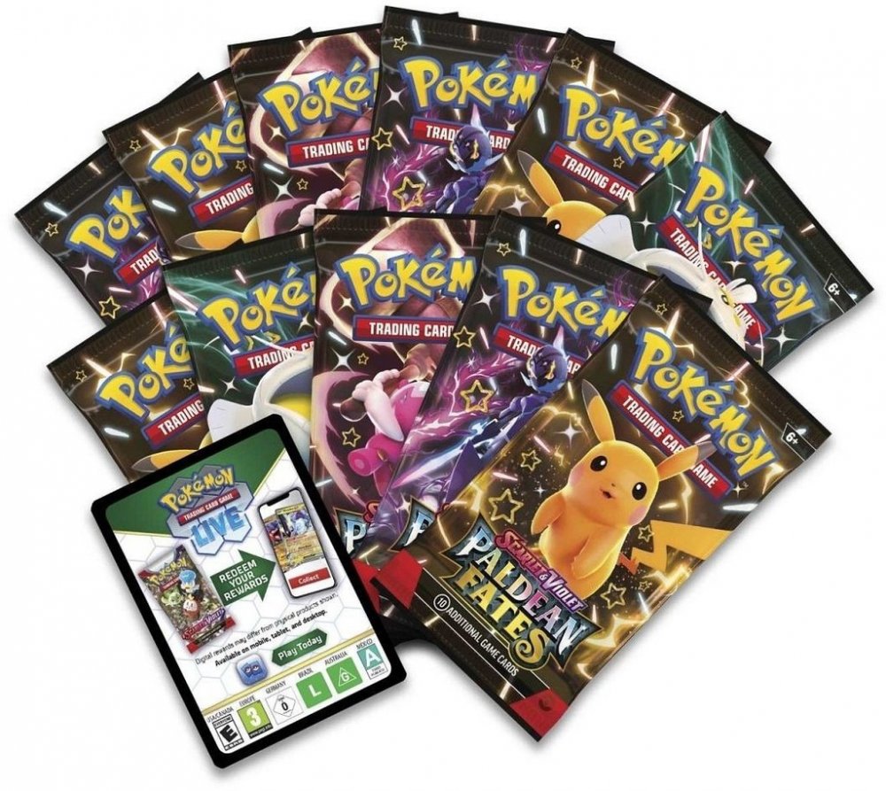 - 9 boosterů z edice Scarlet and Violet Paldean Fates, připravených rozšířit vaši sbírku o 10 náhodných karet v každém balíčku.