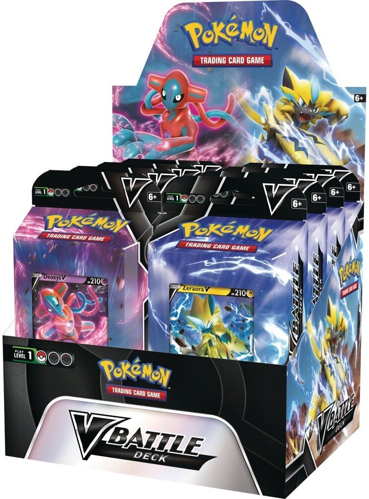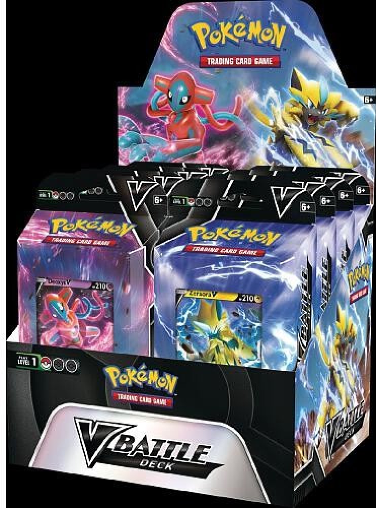 Publikace: Pokémon TCG: V Battle Deck - Deoxys vs. Zeraora. Pokémon TCG V Battle Deck je balení, které obsahuje jeden předem připravený herní balíček s Pokémonem Deoxys V nebo Zeraora V a herní příslušenství, které ocení zejména začátečníci, kteří chtějí začít hrát karetní hru Pokémon a mít ve sbírce zajímavý herní balíček se silným Pokémonem V. Součástí balení je také kód do online hry a pravidla...
