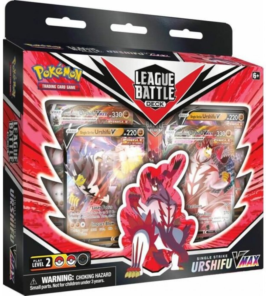 Balíček Pokémon League Battle Deck obsahuje:- Plný, hratelný balíček 60 karet plný silných karet.- 2 fóliové karty s motivem Single Strike Urshifu V nebo Rapid Strike Urshifu V.- 2 fóliové karty s motivem Single Strike Urshifu VMAX nebo Rapid Strike Urshifu VMAX.- 2 mincovní značky stavu- 6 kostek s počítadlem poškození a 1 kostka pro soutěžní házení mincí- 1 kniha pravidel Pokémon TCG- 1 stručná příručka k odemknutí strategií v ní obsažených- Kódová karta pro Pokémon TCG Online