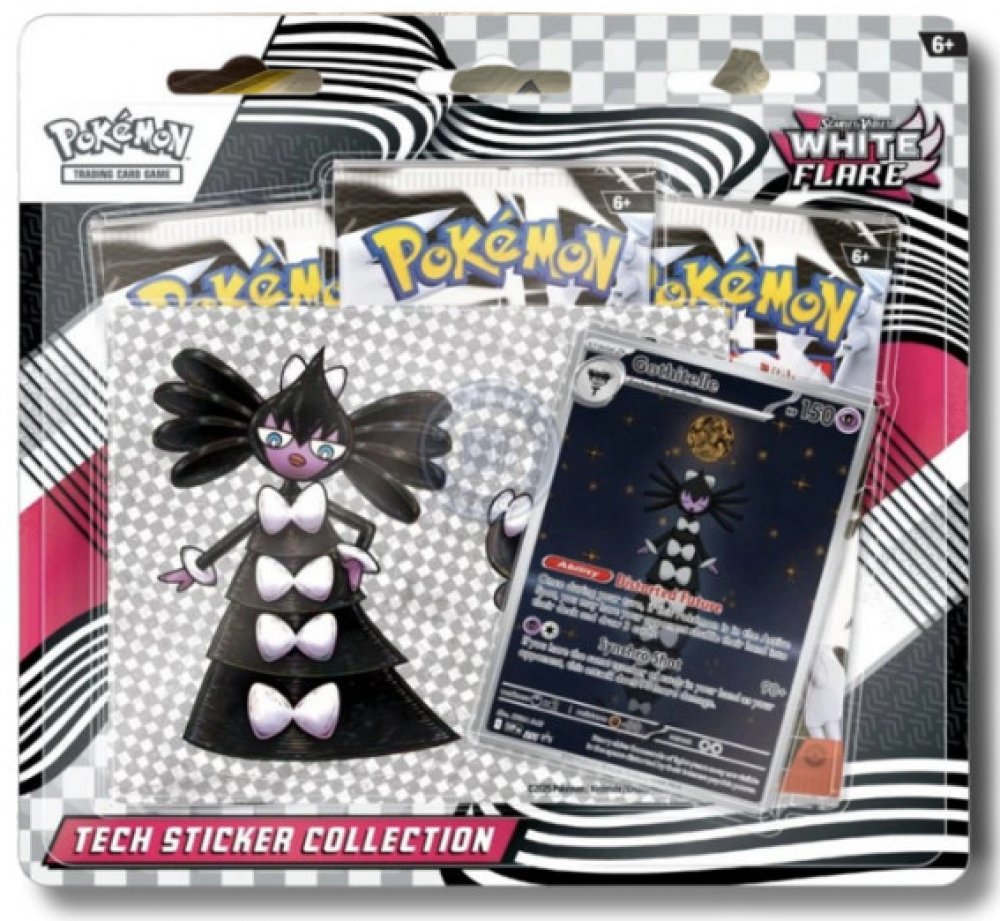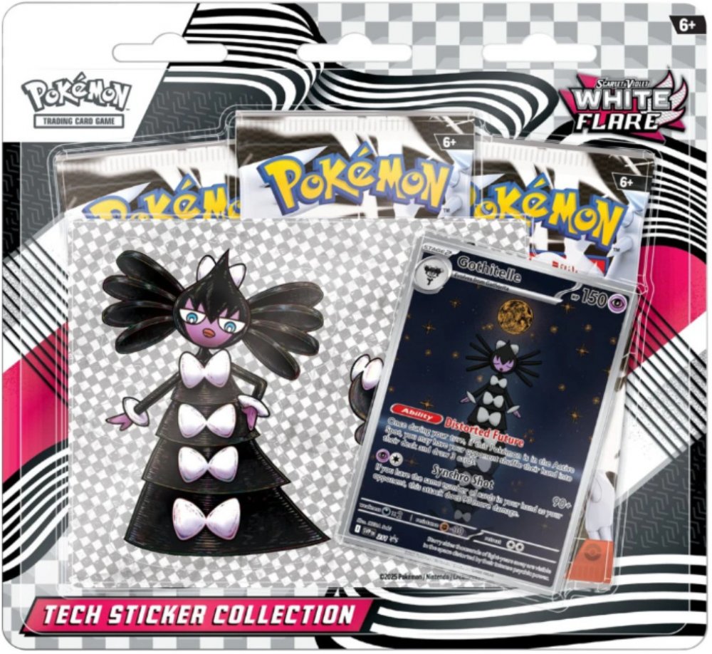 Uvnitř balení na vás čeká foilová promo karta Pokémona Gothitelle, která nesmí chybět v žádné kolekci, a arch se samolepkami. Těšit se můžete také na 3 boostery ze sady Scarlet & Violet – White Flare, plné nových Pokémonů a trenérských karet.