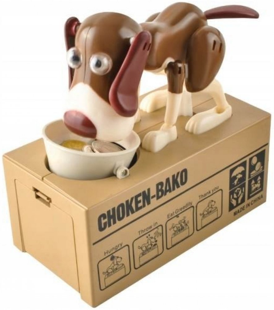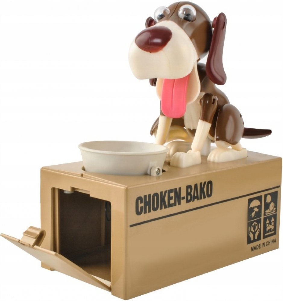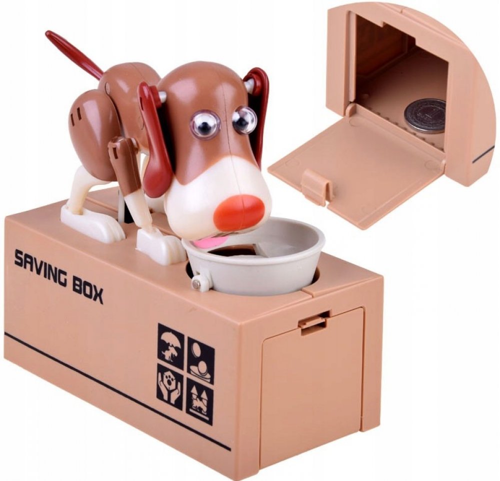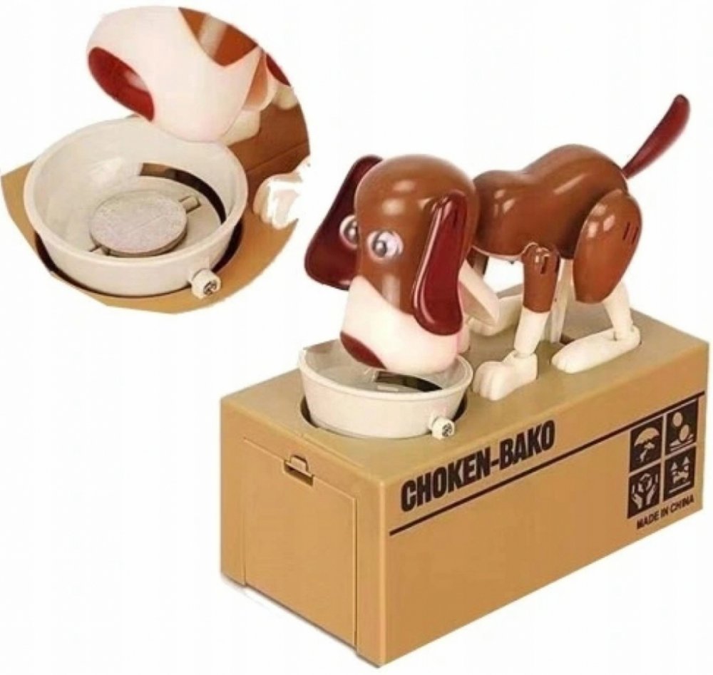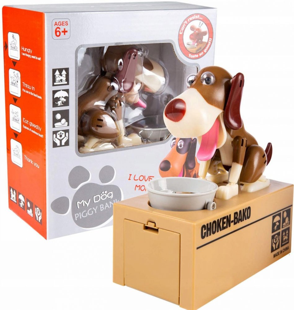 Originální kasička ve tvaru krabice s pejsekm, kterému když položíte na tácek kovové peníze, tak je shrábne dovnitř. Je to skvělý dárek pro každého. Vhodné pro jakékoliv mince i 50-ti korunu. Provedení je celé z plastu Napájení: 2 x AA baterie. (Baterie nejsou součástí balení)