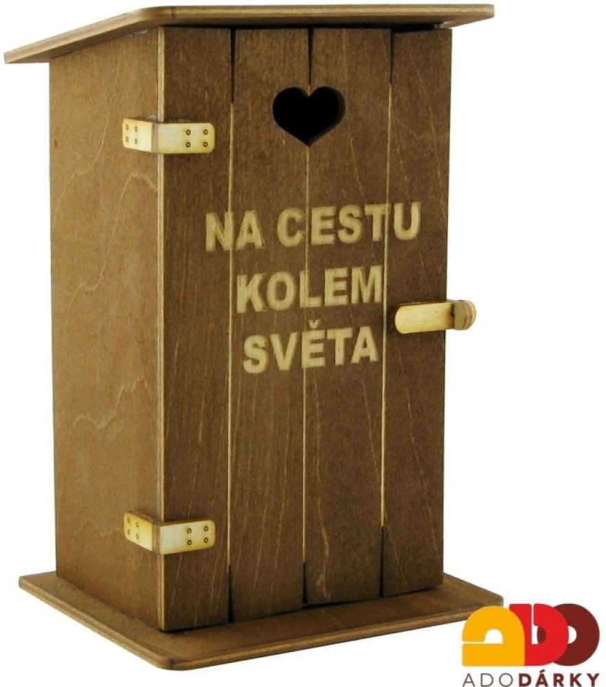 Dřevěná pokladnička ve tvaru kadibudky je skvělým dárkem pro lidi, kteří mají smysl pro humor. Vtipný komentář napovídá, k čemu je možno naspořené peníze použít. Na spodní straně je znovu otevíratelný uzávěr, který dovoluje vybrat finance bez nutnosti rozbíjet pokladničku.