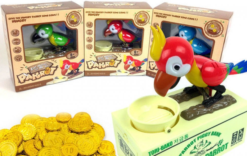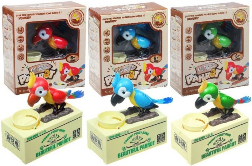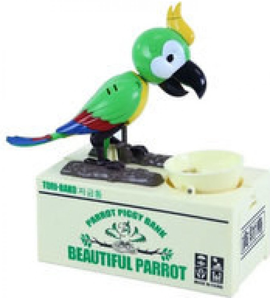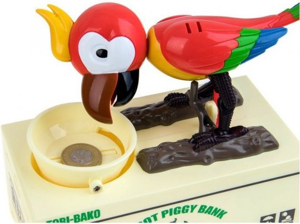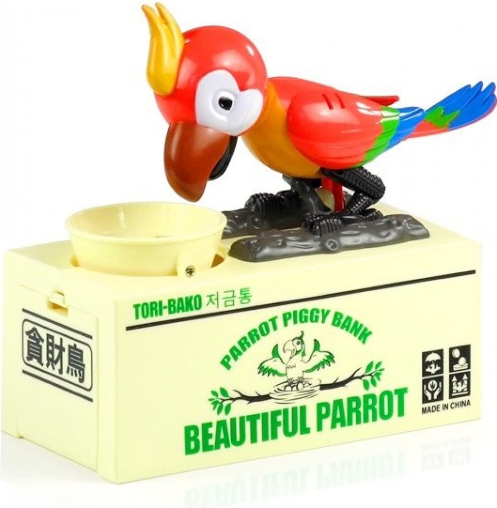 Pokladnička, kam bude děti bavit ukládat další a další penízky. Po vložení mince do misky se papoušek šťastně rozhýbe a začne "zobat" mince z misky. Svým vrtěním kováky natřese do misky tak, aby propadly do spodního úložného prostoru této kouzelné a originální pokladničky!